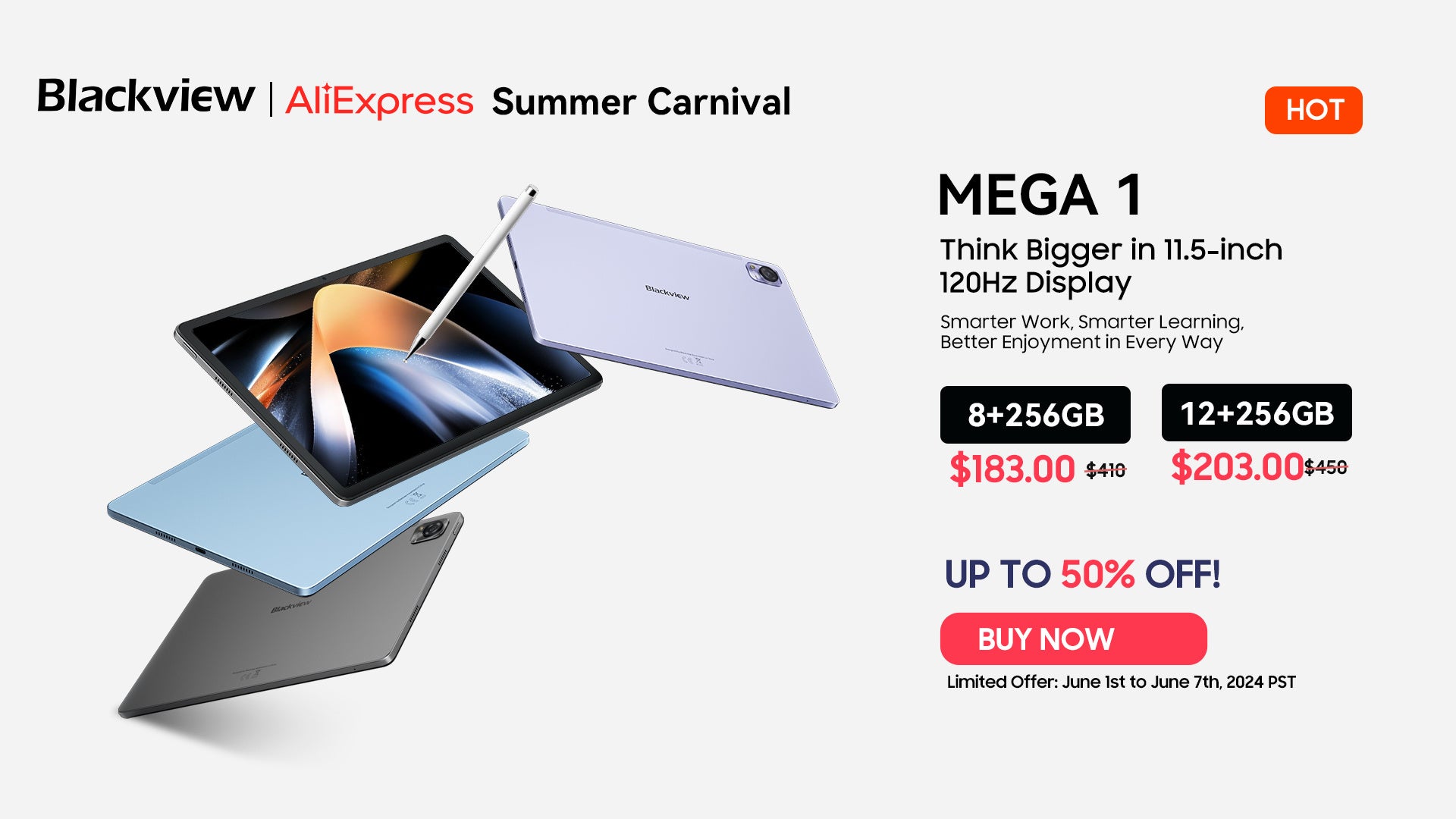 Blackview MEGA 1は11.5インチの2.4K 120Hzディスプレイを備えたAndroidタブレットです。Widevine L1認証取得、クアッドスピーカー内蔵により、Netflixなどの配信サービスを1080Pの高画質設定でストリーミング視聴できます。Blackviewのタブレットで初めて、50MPのSamsung® ISOCELL JN1カメラを搭載しています。Helio G99オクタコアプロセッサーにより、一般的なタブレット作業からゲームまでをスムーズにこなせます。PCモード2.0により、マルチタスクもスムーズ実行。パッケージにはスタイラスペンも付属しています。8,800mAhの大容量バッテリーを搭載し、33Wの急速充電にも対応しています。