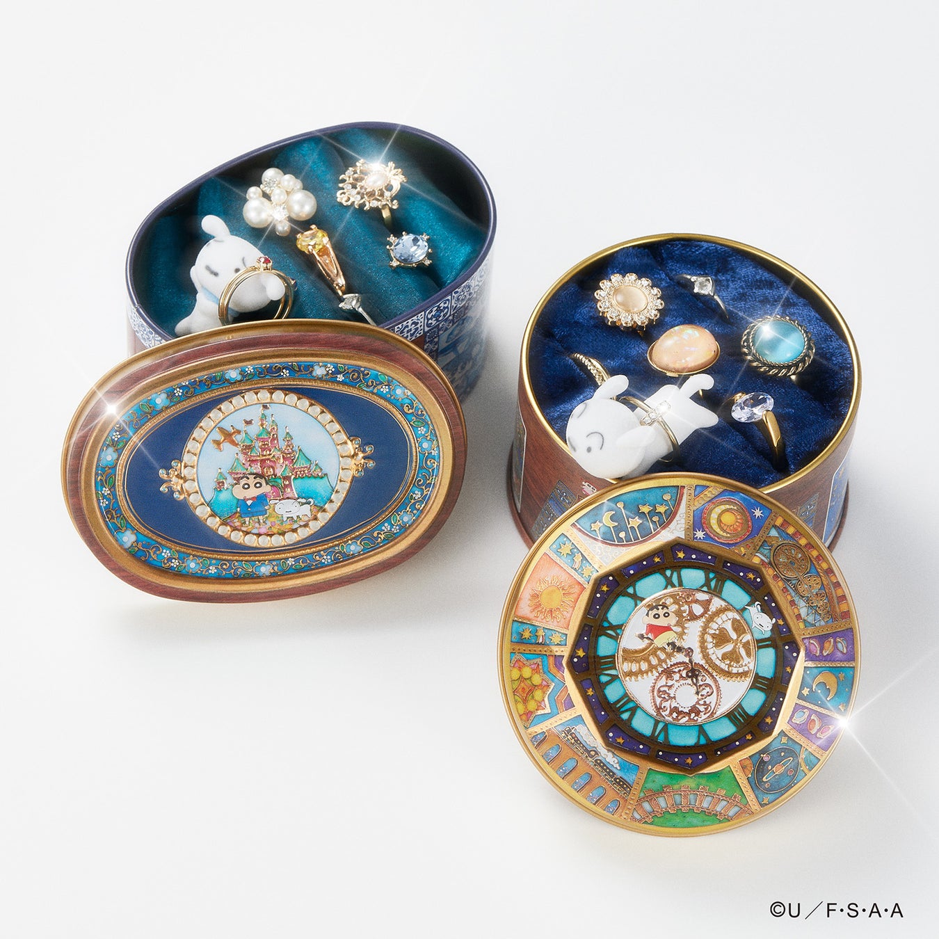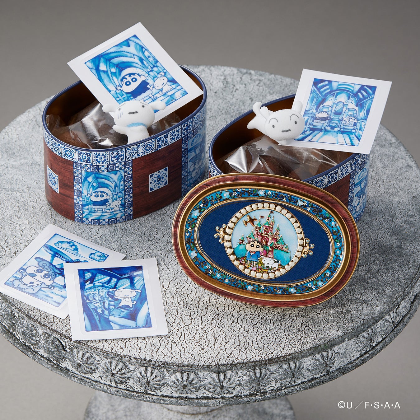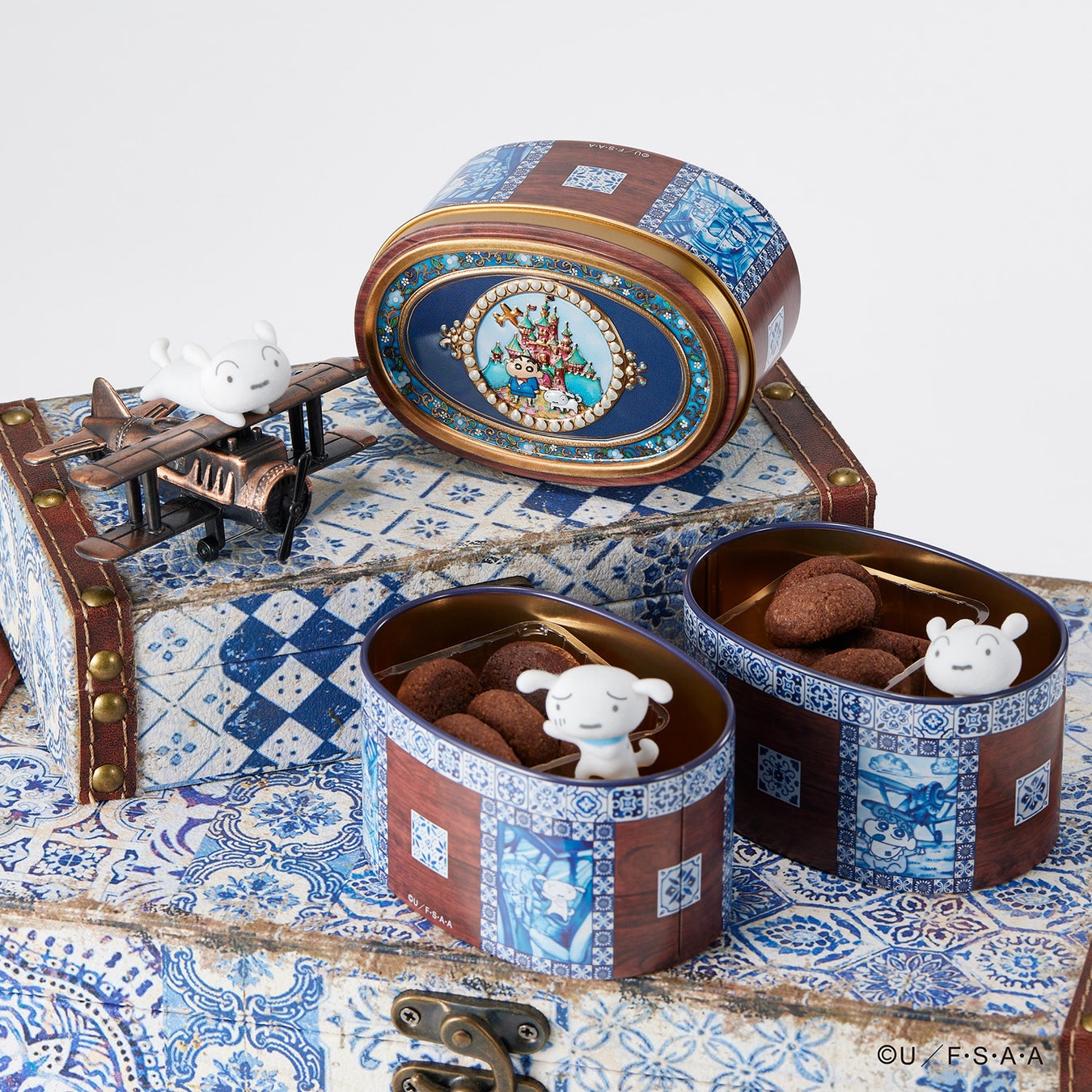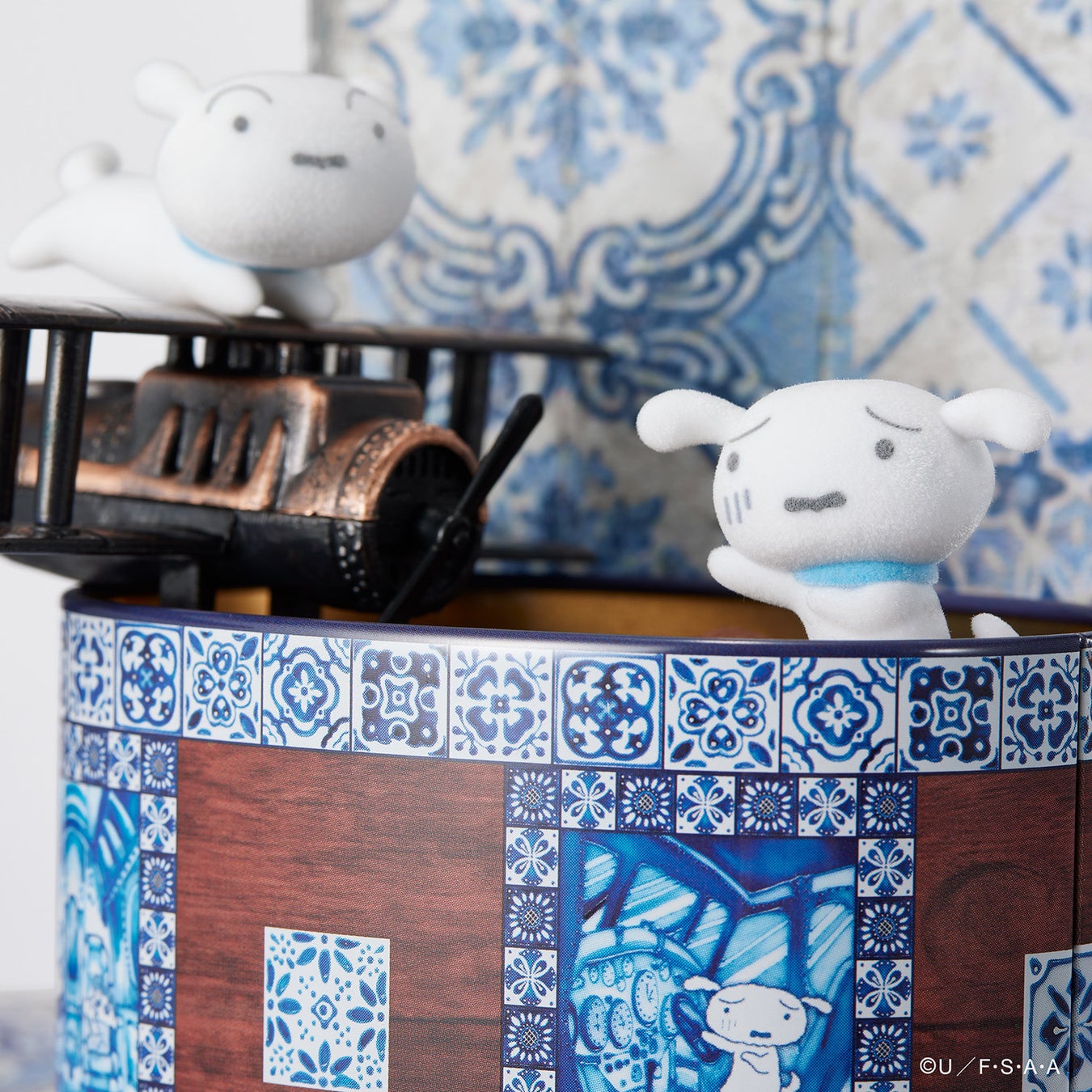 ヨーロッパ風タイル✖️宝石箱『クレヨンしんちゃん飛行機缶』が新登場!ふわふわ質感のシロのフロッキーフィギュアとステッカー付き。