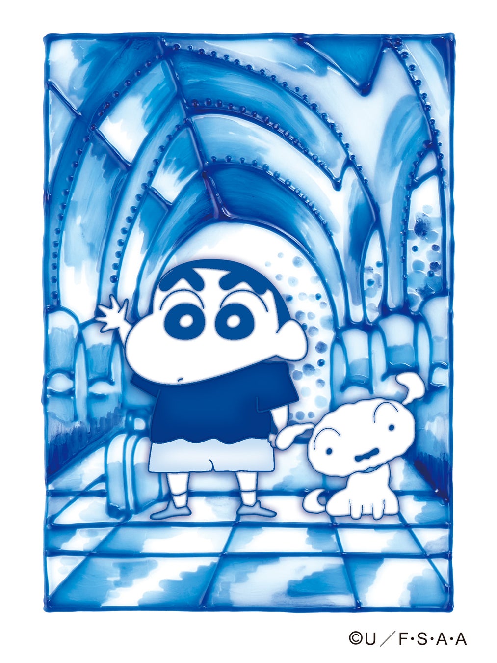 飛行機の操縦を任されたのは…?しんちゃんたちの空の旅をヨーロッパ風タイルデザインで表現