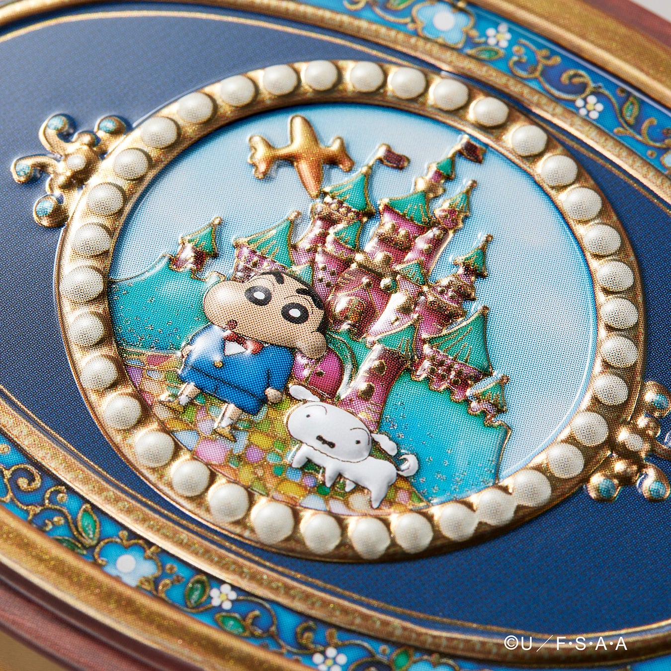 蓋面には、よそゆきの服に身を包んだしんちゃんとシロが、お城の前で記念撮影している1シーン。しんちゃんやシロの顔がエンボス加工でぷっくりしており、とても可愛い仕上がりです。