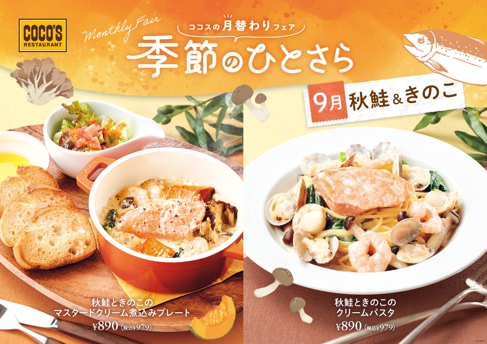 【ココス】9月は秋の味覚!“北海道産秋鮭”&“きのこ”豊かな味わいの煮込みプレート&クリームパスタ