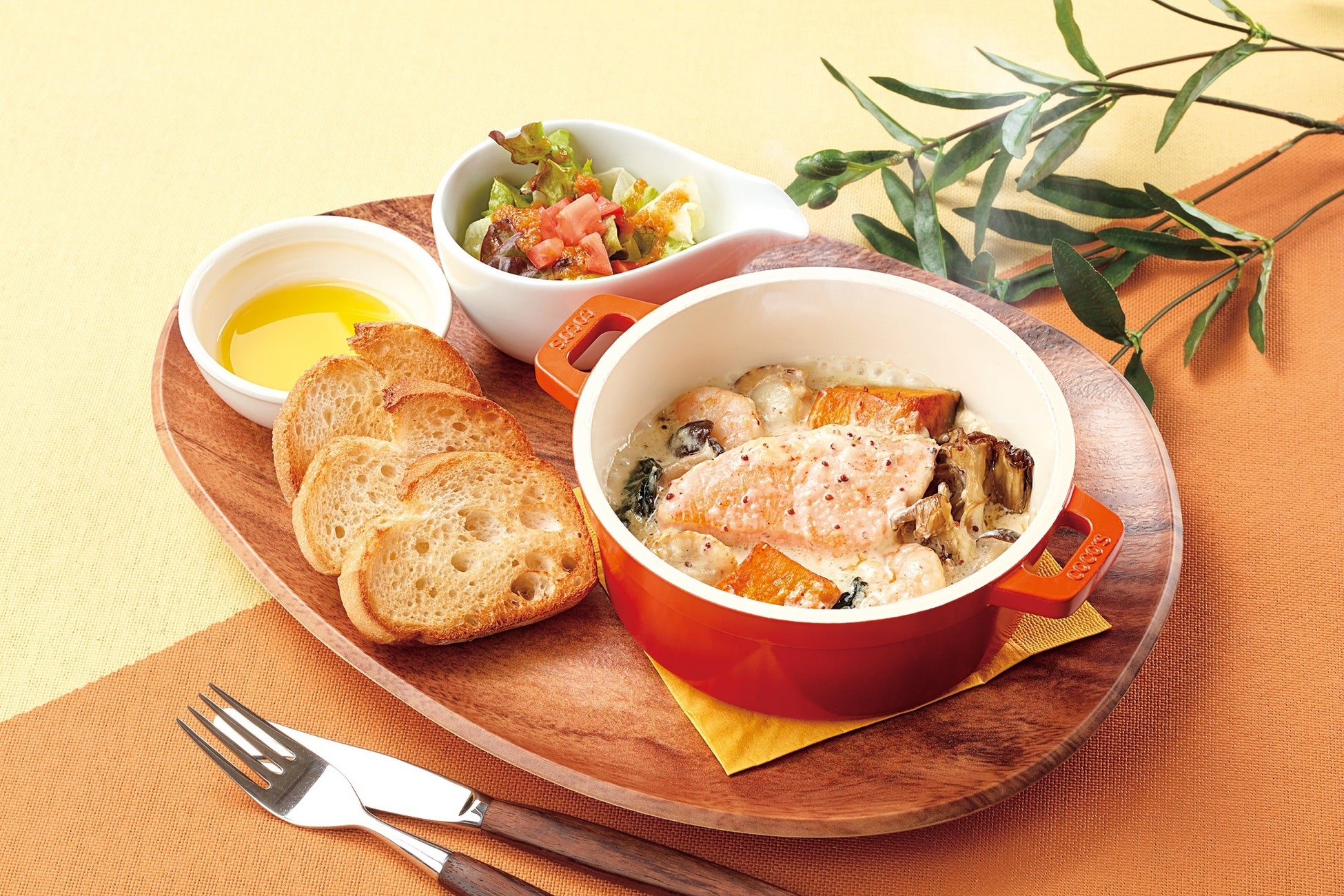 別添えのオリーブオイルはバゲットをひたしても、マスタードクリーム煮込みにひとまわしし、さらに豊かな風味への味変としても相性抜群です。サラダもセットになった、お得なワンプレートです。