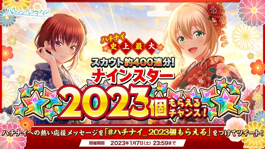 株式会社アカツキゲームス(本社:東京都品川区、代表取締役:戸塚佑貴、株式会社アカツキ100%子会社)は、当社より好評配信中のiOS/Android用アプリ『八月のシンデレラナイン(略称:ハチナイ)』において、本日2023年1月1日(日)より、新春2023キャンペーンを開催いたします。期間中、最大ナインスターが50個もらえるログインボーナスや、ハチナイ史上最大のナインスター2023個(スカウト400連分相当)がもらえるTwitterキャンペーンも実施いたします。また、URに覚醒できるSSR野崎夕姫(cv.南早紀)が新登場いたします。