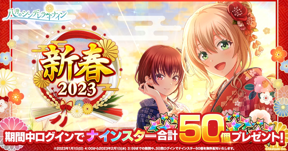 『八月のシンデレラナイン』、新春2023キャンペーンを開催! ログインで最大ナインスター50個をプレゼント!また、ハチナイ史上最大のナインスター2023個が当たるキャンペーンも開催