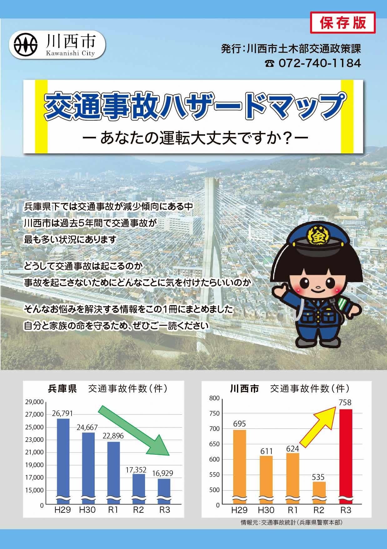 兵庫県下では交通事故が減少傾向にある中、川西市は過去5年間で交通事故が最も多い状況である。その状況を受け、交通事故が発生している箇所を市内のコミュニティ単位の地図に示したハザードマップを発行し、「どうして事故は起こるのか?」、「事故を起こさないためにどんなことに気を付けたらいいのか?」を皆さんに考えてもらうため、市内全戸に配布する。