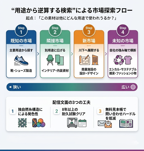 C社は用途から逆算してターゲットを探すアプローチを行いました。まず主要用途である「靴・シューズ製造」企業にアプローチした後、「インテリア・内装資材」「商業施設の設計・デザイン」と段階的にターゲットを拡大。さらに、リサイクル素材の強みを活かし「エシカル」「サステナブル」をキーワードに業種横断の検索も実施しました。