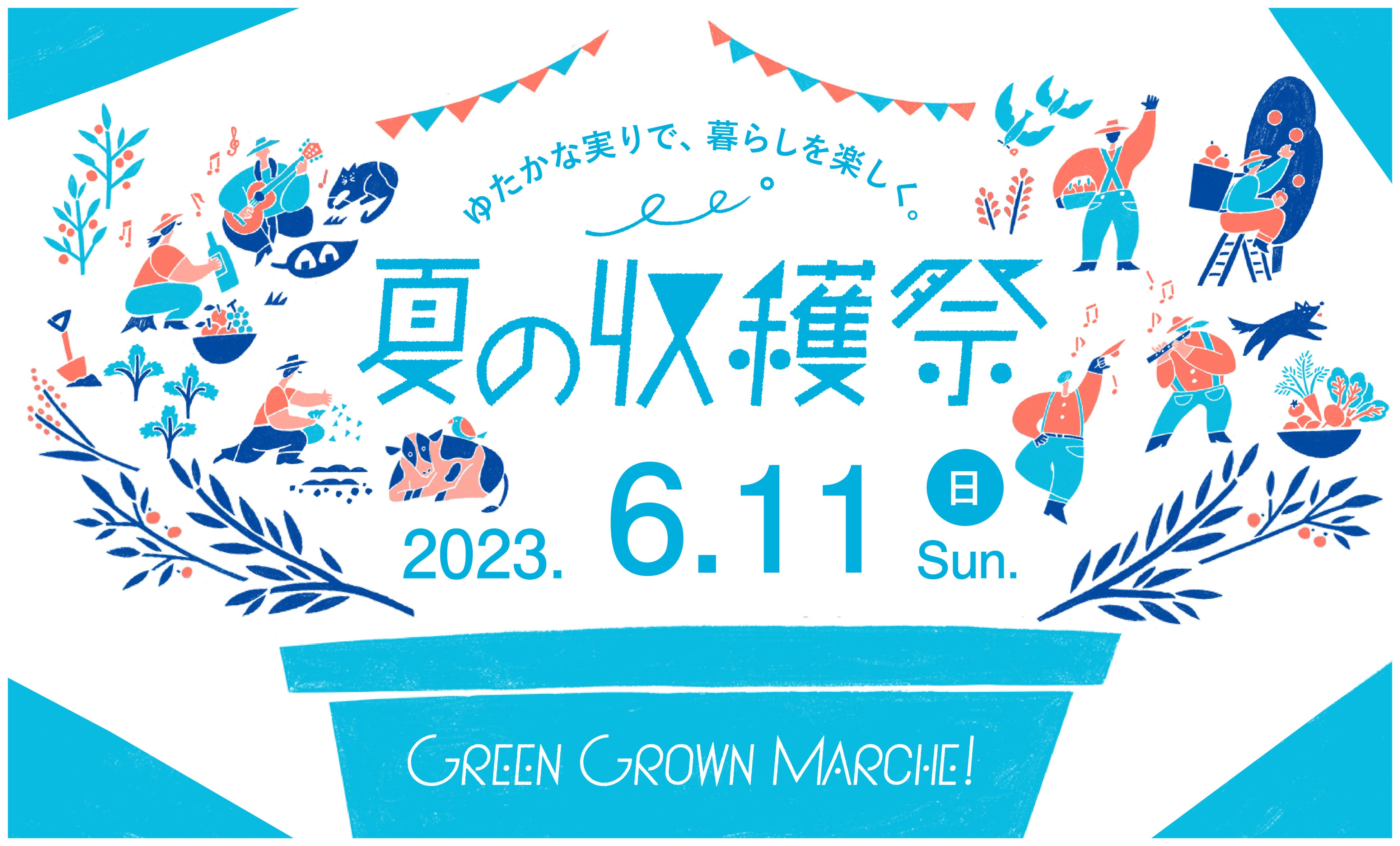毎週火曜日に開催しているGREEN GROWN MARCHE!の拡大版として、野菜や果物、種苗、加工品(焼き菓子、調味料、コーヒー)、パン等の「食」を中心としたマルシェ(25店舗予定)、さらにフリーライブや当日気軽に参加できるワークショップを開催します。