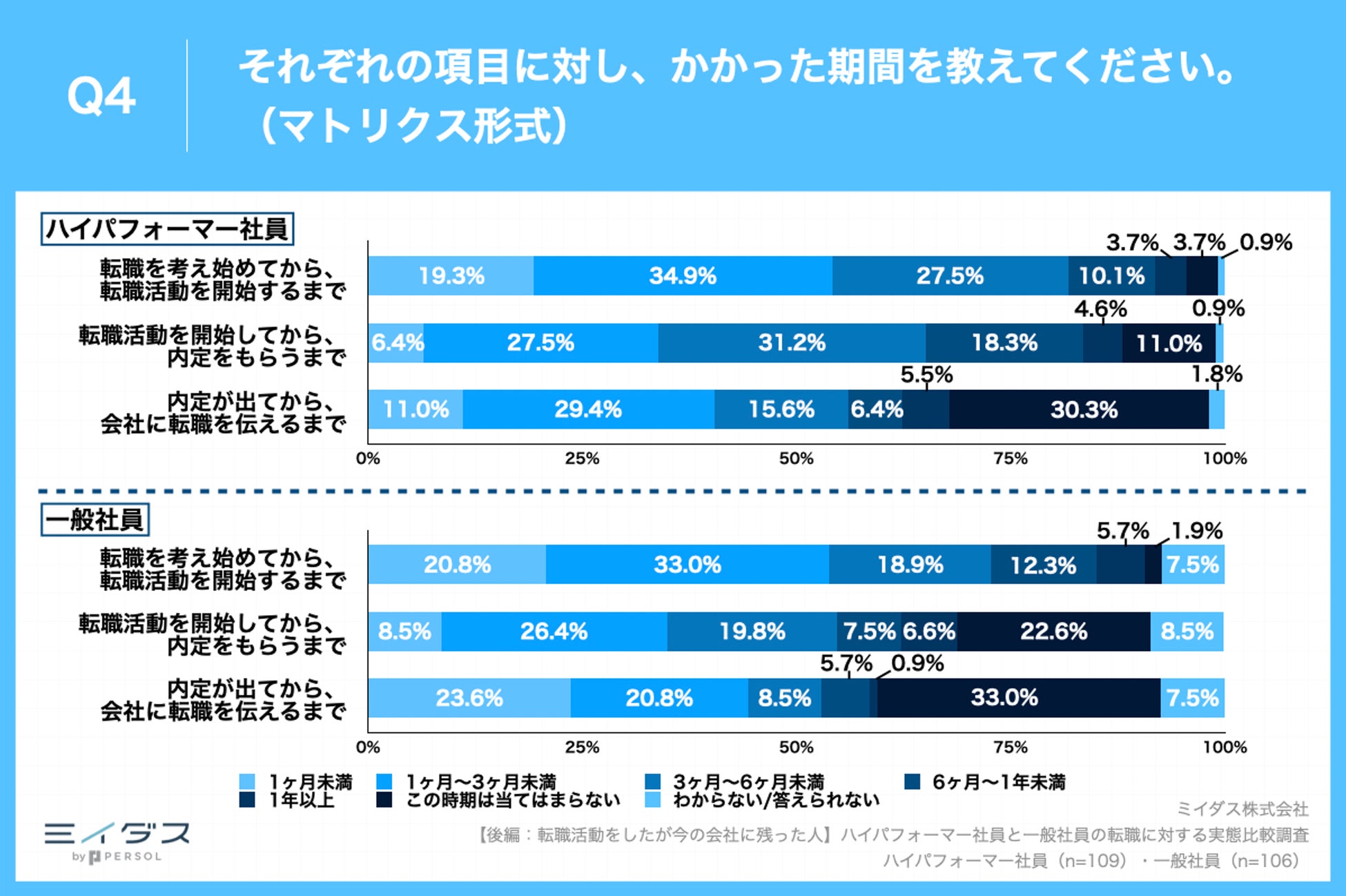 「Q4.それぞれの項目に対し、かかった期間を教えてください。(マトリクス形式)」と質問したところ、ハイパフォーマー社員(n=109)は「転職を考え始めてから、転職活動を開始するまで」では「1ヶ月~3ヶ月未満」が34.9%、一般社員(n=106)は「転職を考え始めてから、転職活動を開始するまで」では「1ヶ月~3ヶ月未満」が33.0%などという回答になりました。