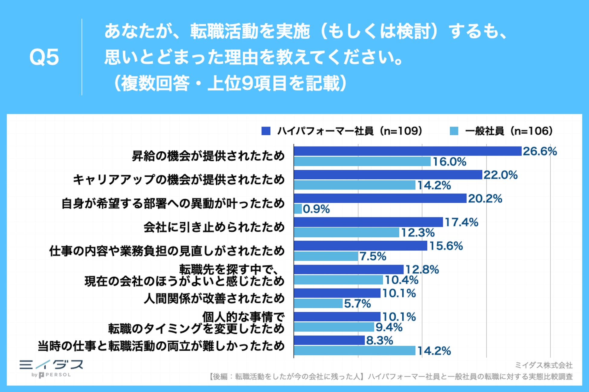 「Q5.あなたが、転職活動を実施(もしくは検討)するも、思いとどまった理由を教えてください。(複数回答)」と質問したところ、ハイパフォーマー社員(n=109)は「昇給の機会が提供されたため」が26.6%、一般社員(n=106)は「昇給の機会が提供されたため」が16.0%という回答になりました。