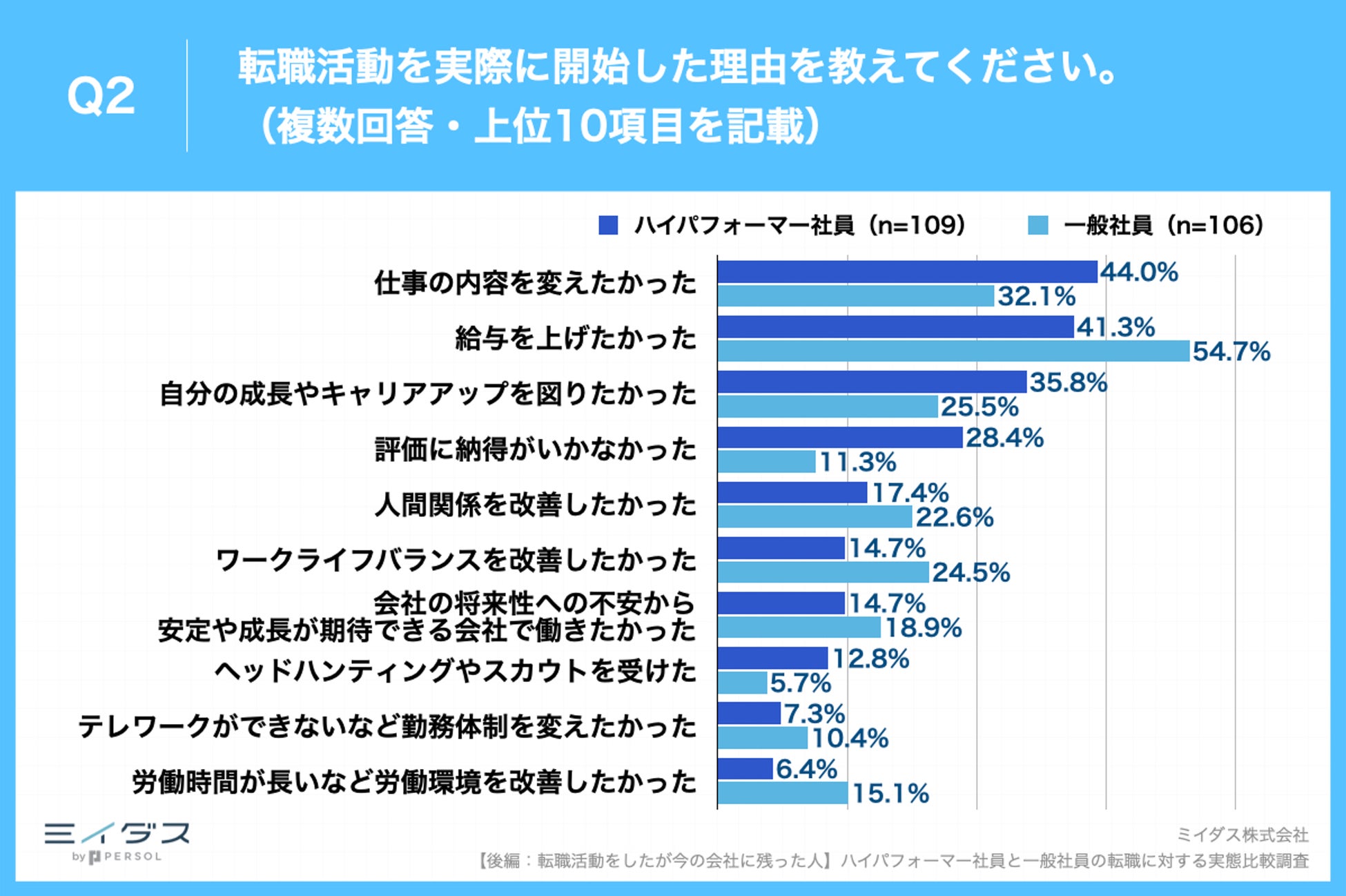 転職活動を開始した理由、ハイパフォーマー社員は「仕事の内容を変えたかった」、一般社員は「給与を上げたかった」の声多数