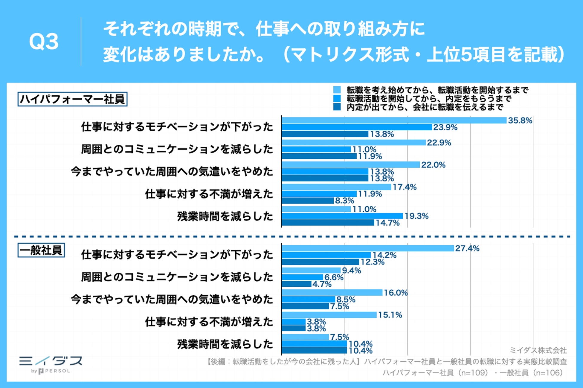 「Q3.それぞれの時期で、仕事への取り組み方に変化はありましたか。(マトリクス形式)」と質問したところ、ハイパフォーマー社員(n=109)は「転職を考え始めてから、転職活動を開始するまで」では「仕事に対するモチベーションが下がった」が35.8%、一般社員(n=106)は「転職を考え始めてから、転職活動を開始するまで」では「仕事に対するモチベーションが下がった」が27.4%などという回答になりました。