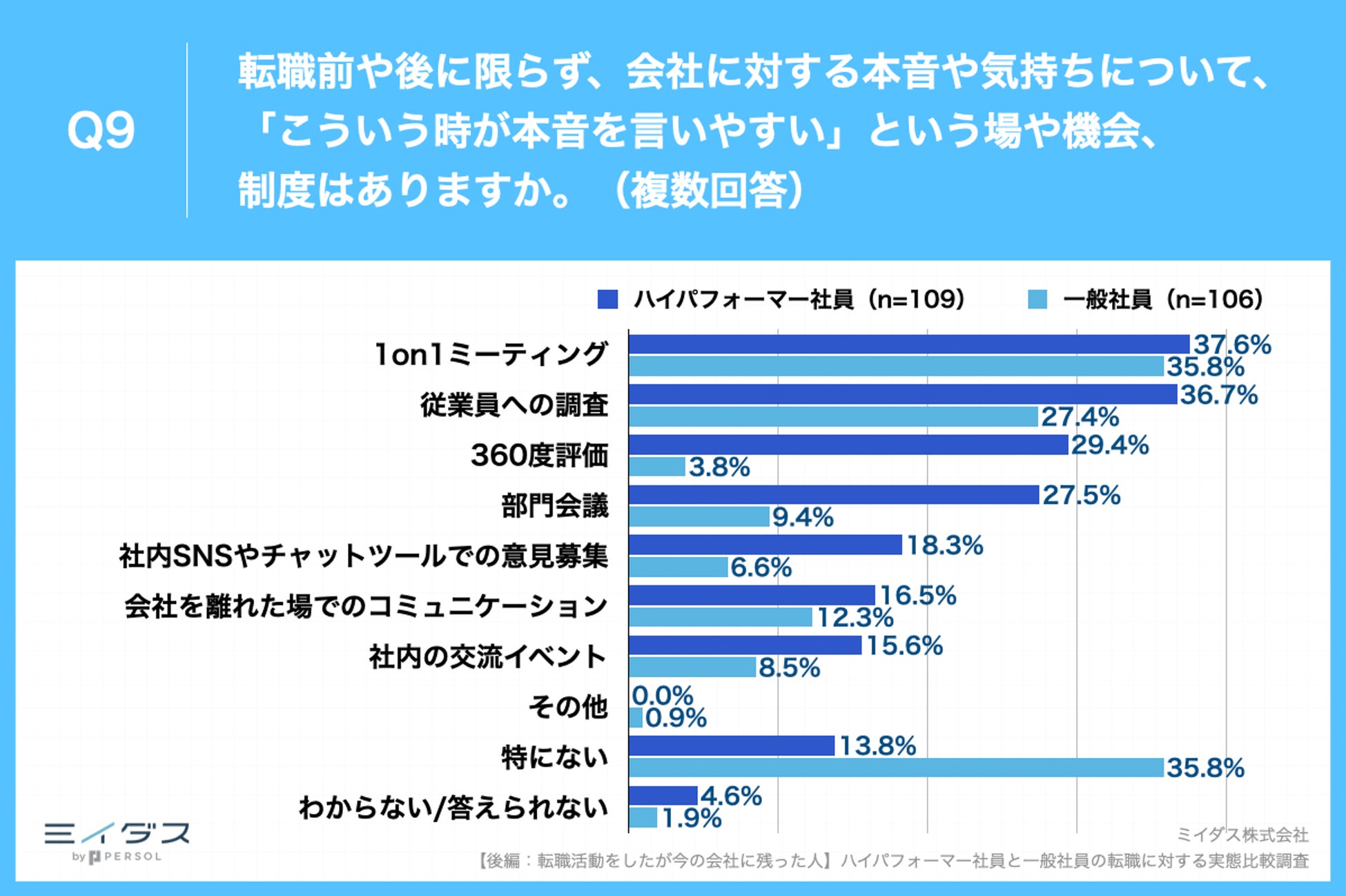 「Q9.転職前や後に限らず、会社に対する本音や気持ちについて、「こういう時が本音を言いやすい」という場や機会、制度はありますか。(複数回答)」と質問したところ、ハイパフォーマー社員(n=109)は「1on1ミーティング」が37.6%、一般社員(n=106)は「1on1ミーティング」「特にない」が35.8%という回答になりました。