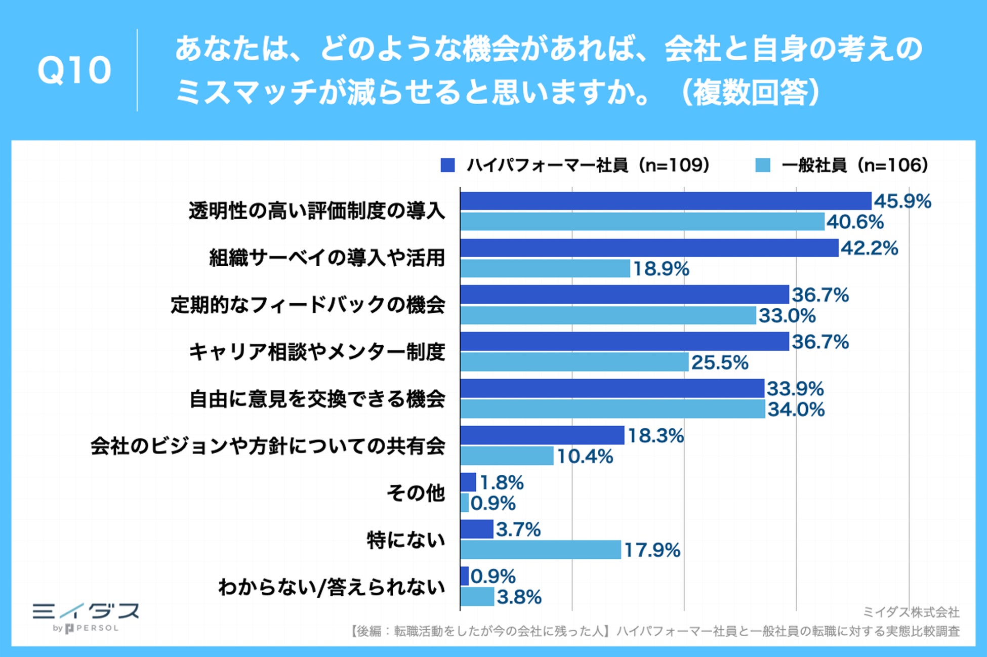 「Q10.あなたは、どのような機会があれば、会社と自身の考えのミスマッチが減らせると思いますか。(複数回答)」と質問したところ、ハイパフォーマー社員(n=109)は「透明性の高い評価制度の導入」が45.9%、一般社員(n=106)は「透明性の高い評価制度の導入」が40.6%という回答になりました。また、「組織サーベイの導入や活用」は前編調査と同様、ハイパフォーマー社員の支持は一般社員の約2倍と高く、客観的に意見を言える機会や制度が求められる結果となりました。