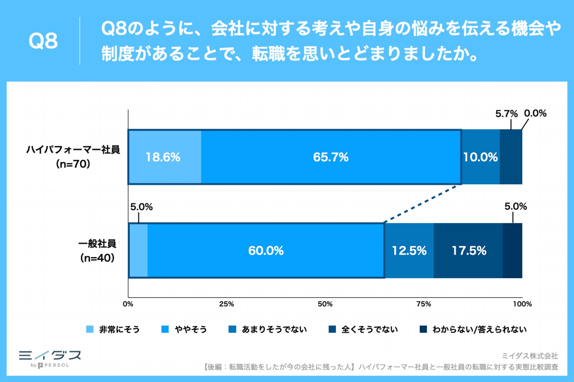 Q7で「とてもある」「ややある」と回答した方に、「Q8.Q7のように、会社に対する考えや自身の悩みを伝える機会や制度があることで、転職を思いとどまりましたか。」と質問したところ、ハイパフォーマー社員(n=70)は「非常にそう」「ややそう思う」の合計が84.3%、一般社員(n=40)は「非常にそう」「ややそう思う」の合計が65.0%という回答になりました。前編の転職経験者と比較すると、この割合はいずれも40ポイント前後も高く、転職を思いとどまった人の職場では伝える機会や制度があるだけでなく、それが活用されていると言えそうです。