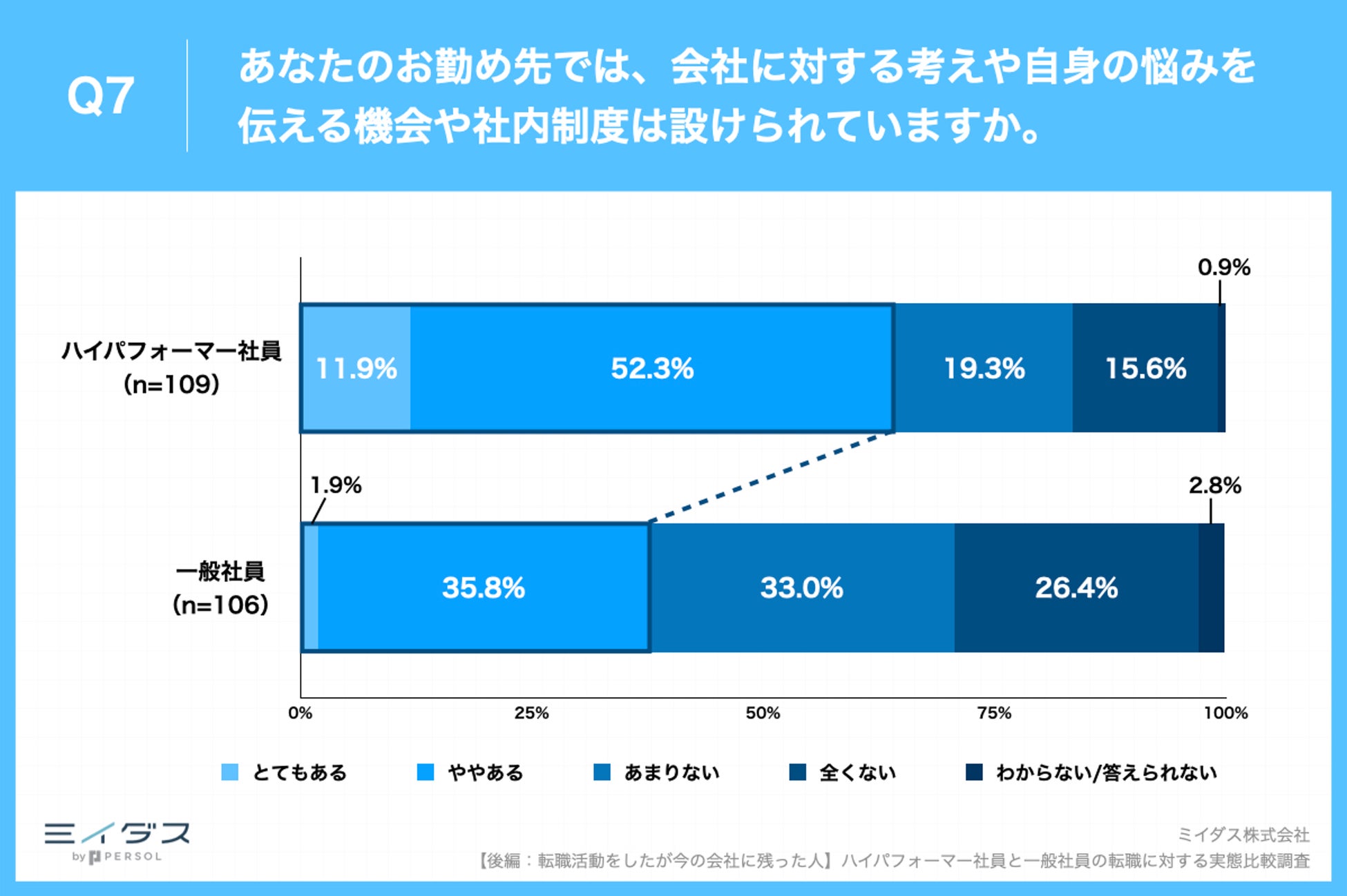 「Q7.あなたのお勤め先では、会社に対する考えや自身の悩みを伝える機会や社内制度は設けられていますか。」と質問したところ、ハイパフォーマー社員(n=109)は「とてもある」「ややある」の合計が64.2%、一般社員(n=106)は「とてもある」「ややある」の合計が37.7%という回答になりました。