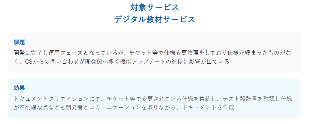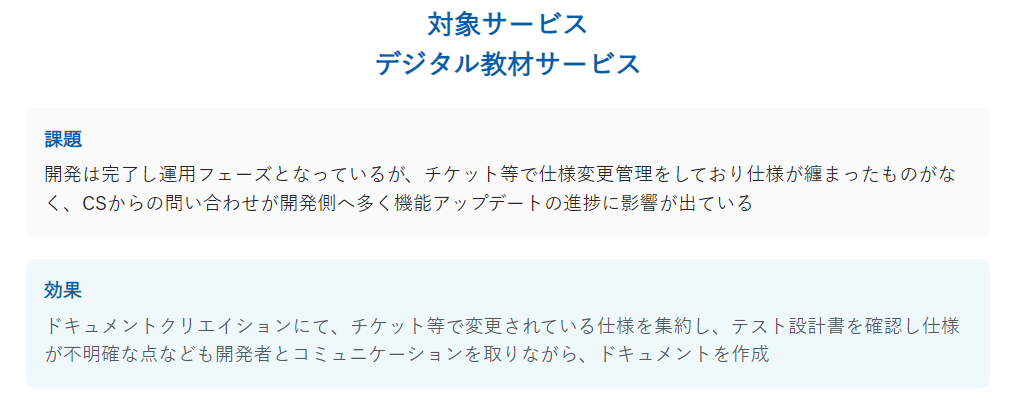 本サービスは、プロダクト開発に取り組む企業様に向けて、ProVisionが提供する様々なQAサービスから開発工程の課題に沿ったものを組み合わせて提供する、オリジナルパッケージ型のサービスです。例えば、運用フェーズにあるもののまとまった仕様書がなく問合せ対応や連携に課題を抱えるケースでは、「QAテスト」に加えドキュメント作成サービス「ドキュメントクリエーション」を提供し、テスト実施と同時に仕様書を作成することが可能です。