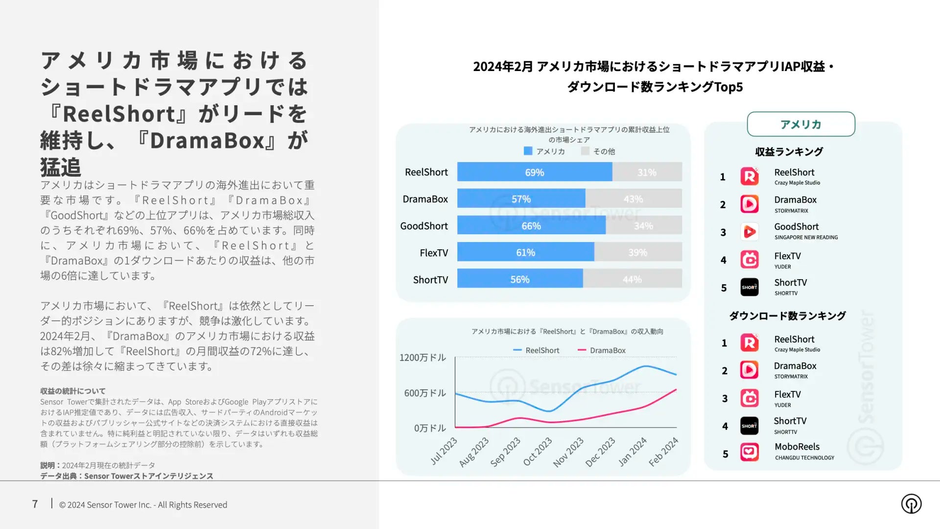 『ReelShort』は依然としてリーダー的ポジションではるものの、ますます激しい競争に直面しています。2024年2月、『DramaBox』のアメリカ市場における収益は82%増加して『ReelShort』の月間収益の72%に達し、差は徐々に縮まっています。