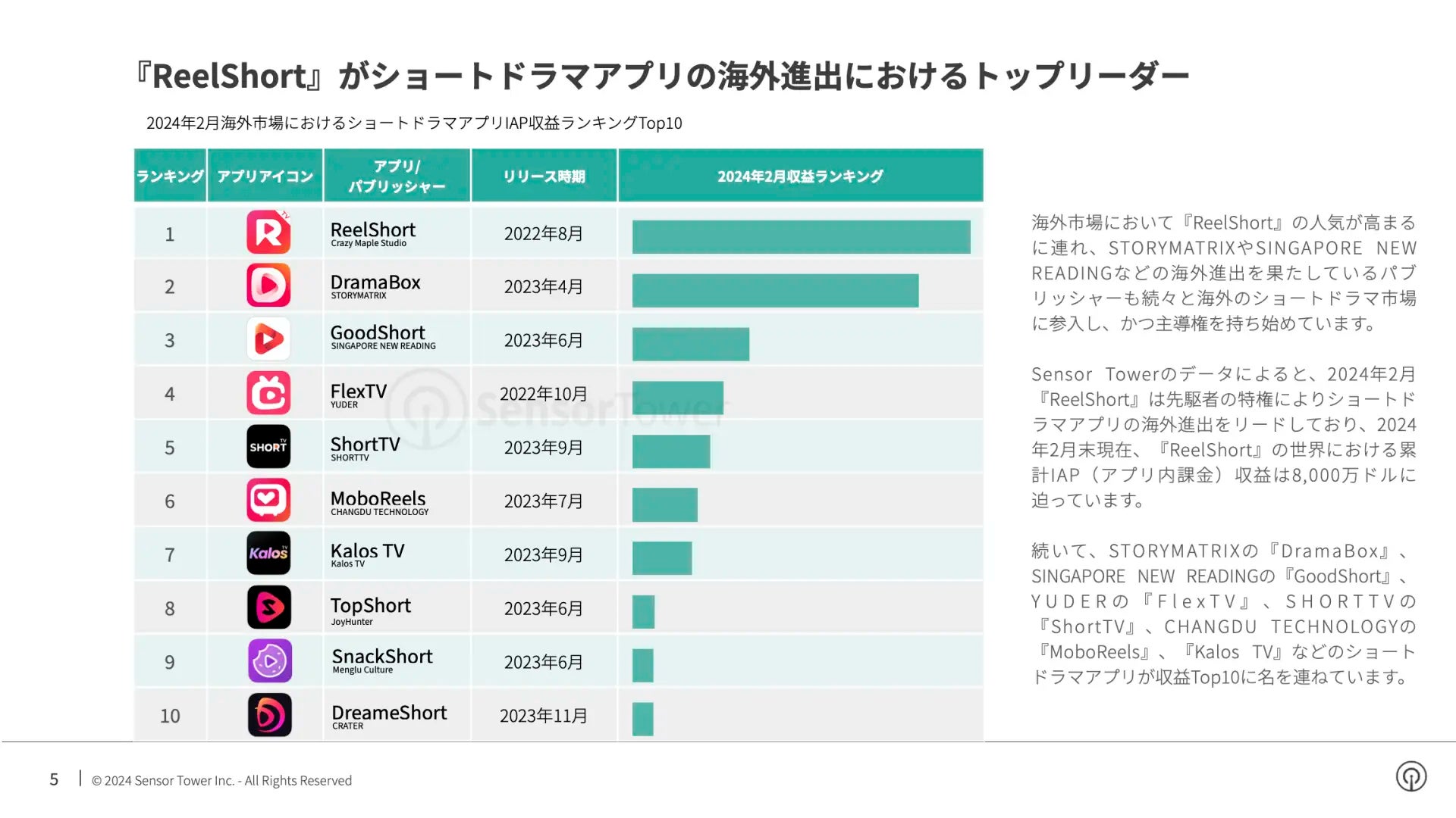 『ReelShort』の海外市場での成功によって、パブリッシャーは続々と海外のショートドラマ市場に進出しています。現在、『ReelShort』が先駆者の特権によりリードし、『DramaBox』がそれに続き、『GoodShort』『FlexTV』『ShortTV』といったショートドラマアプリが収益Top10に名を連ねています。