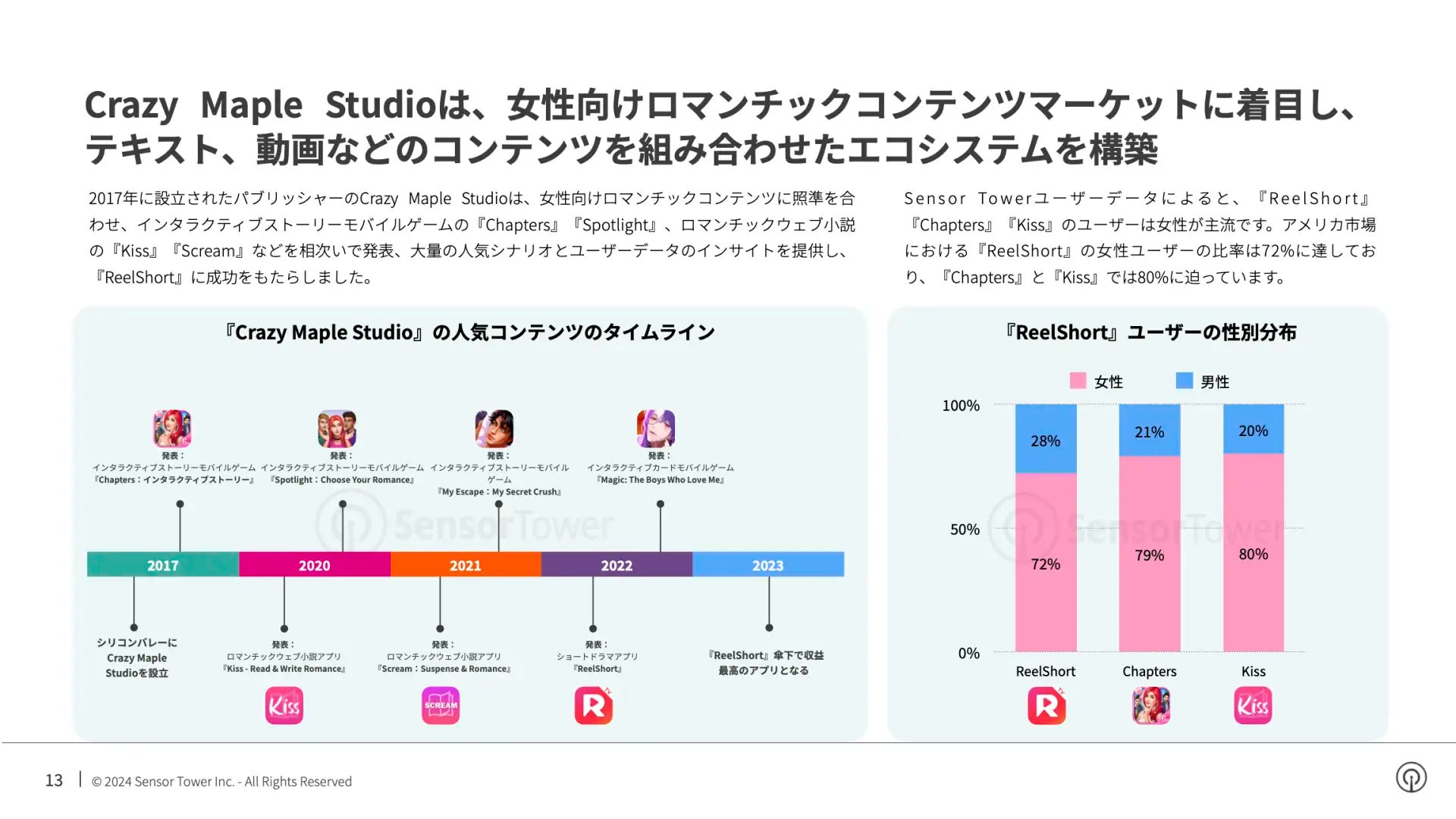 『ReelShort』の超人気ショートドラマの誕生は、パブリッシャーであるCrazy Maple Studioの女性向けロマンチック路線における長年の経験と深い関係があります。2017年に設立されたCrazy Maple Studioは、女性向けロマンチックコンテンツに照準を合わせ、インタラクティブストーリーモバイルゲームの『Chapters』『Spotlight』、ロマンチックウェブ小説の『Kiss』『Scream』などを相次いで発表、大量の人気シナリオとユーザーデータのインサイトを提供し、『ReelShort』に成功をもたらしました。