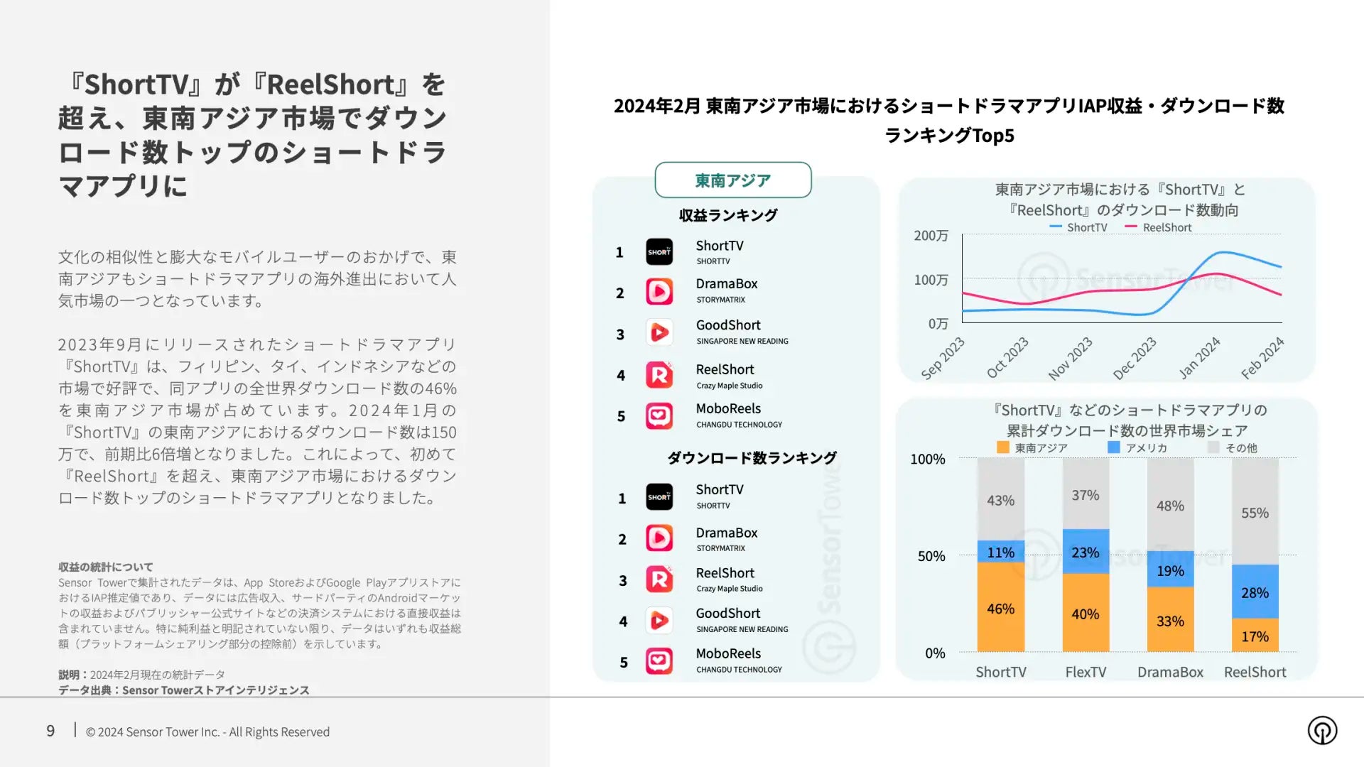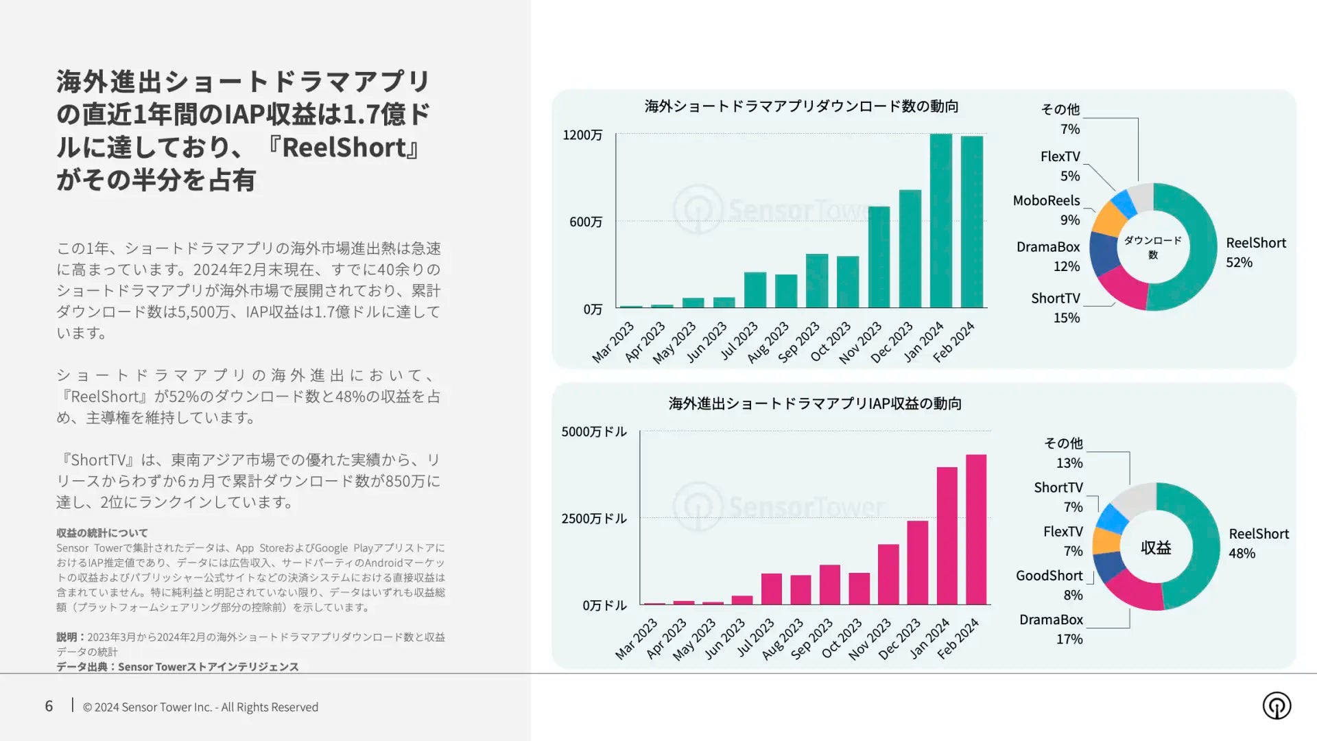 このうち、『ReelShort』が52%のダウンロード数と48%の収益を占め、主導権を維持しています。『ShortTV』は、東南アジア市場での優れた実績から、わずか6ヵ月で国外市場で第2位にランクインしています。