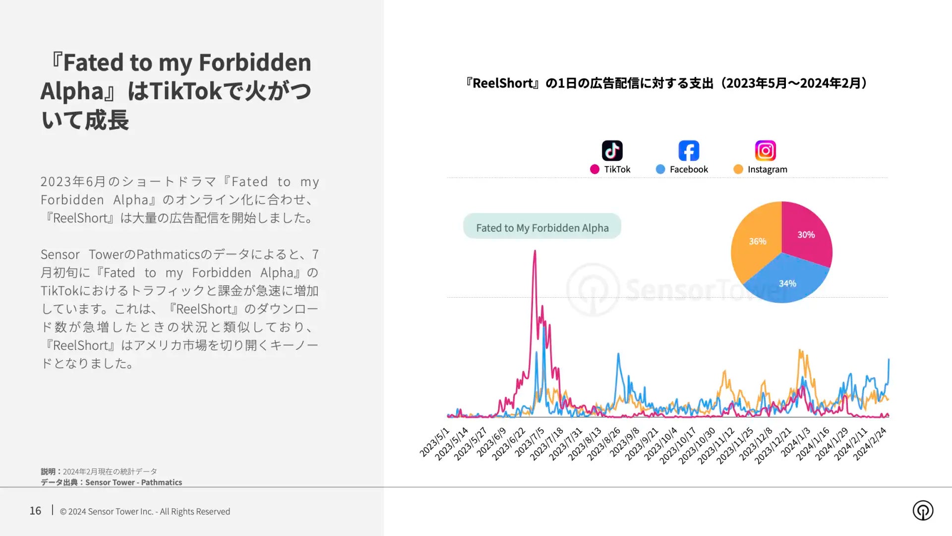 Sensor TowerのPathmaticsのデータによると、7月初旬に『Fated to my Forbidden Alpha』のTikTokにおけるトラフィックと課金が急速に増加しています。これは、『ReelShort』のダウンロード数が急増したときの状況と類似しており、『ReelShort』はアメリカ市場を切り開くキーノードとなりました。