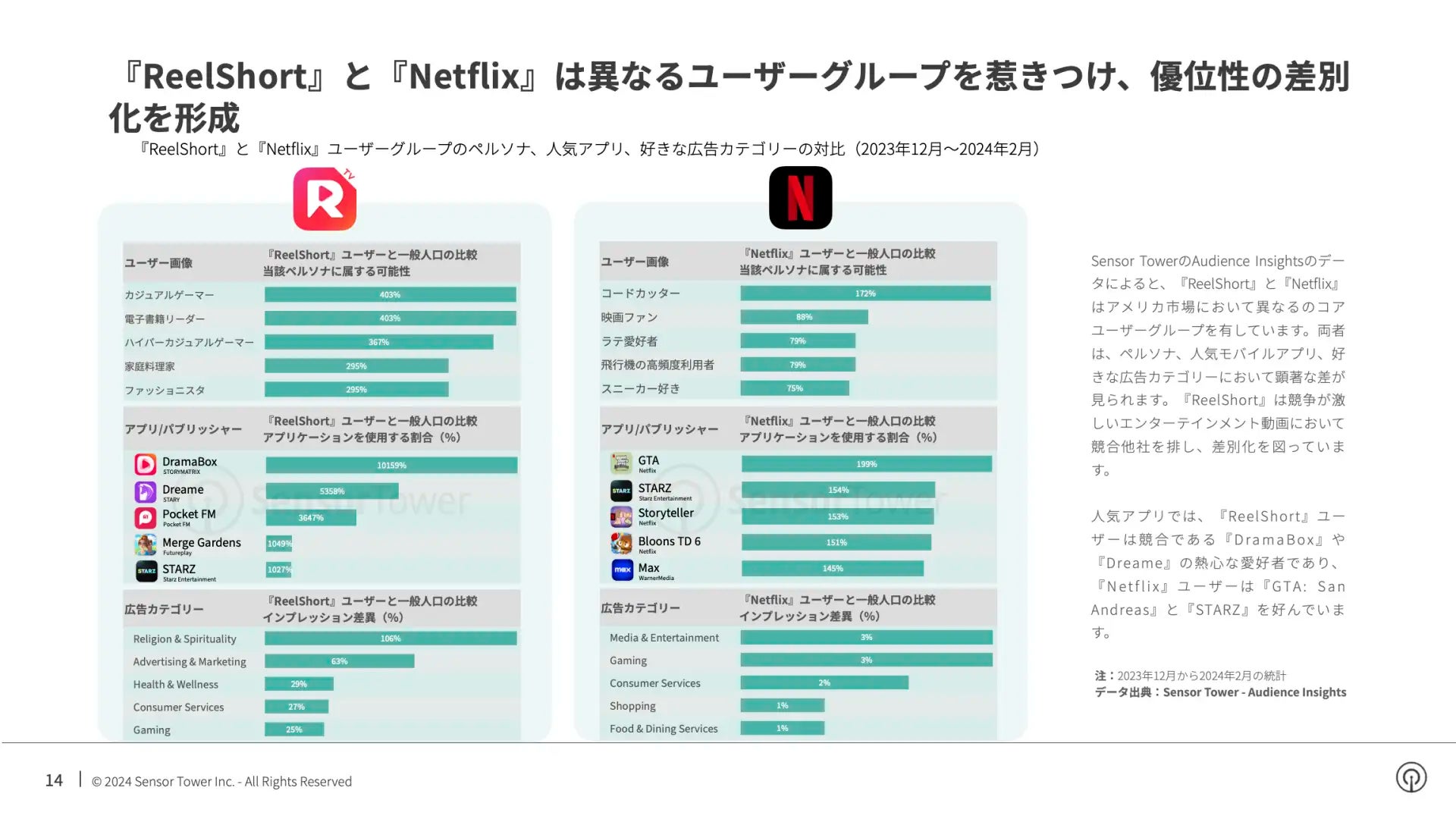 Sensor TowerのAudience Insightsのデータによると、『ReelShort』と『Netflix』はアメリカ市場において異なるコアユーザーグループを有しています。両者は、ペルソナ、人気モバイルアプリ、好きな広告カテゴリーにおいて顕著な差が見られます。『ReelShort』は競争が激しいエンターテインメント動画において競合他社を排し、差別化を図っています。人気アプリでは、『ReelShort』ユーザーは競合である『DramaBox』やウェブ小説『Dreame』の熱心な愛好者であり、『Netflix』ユーザーは『GTA: San Andreas』と『STARZ』を好んでいます。