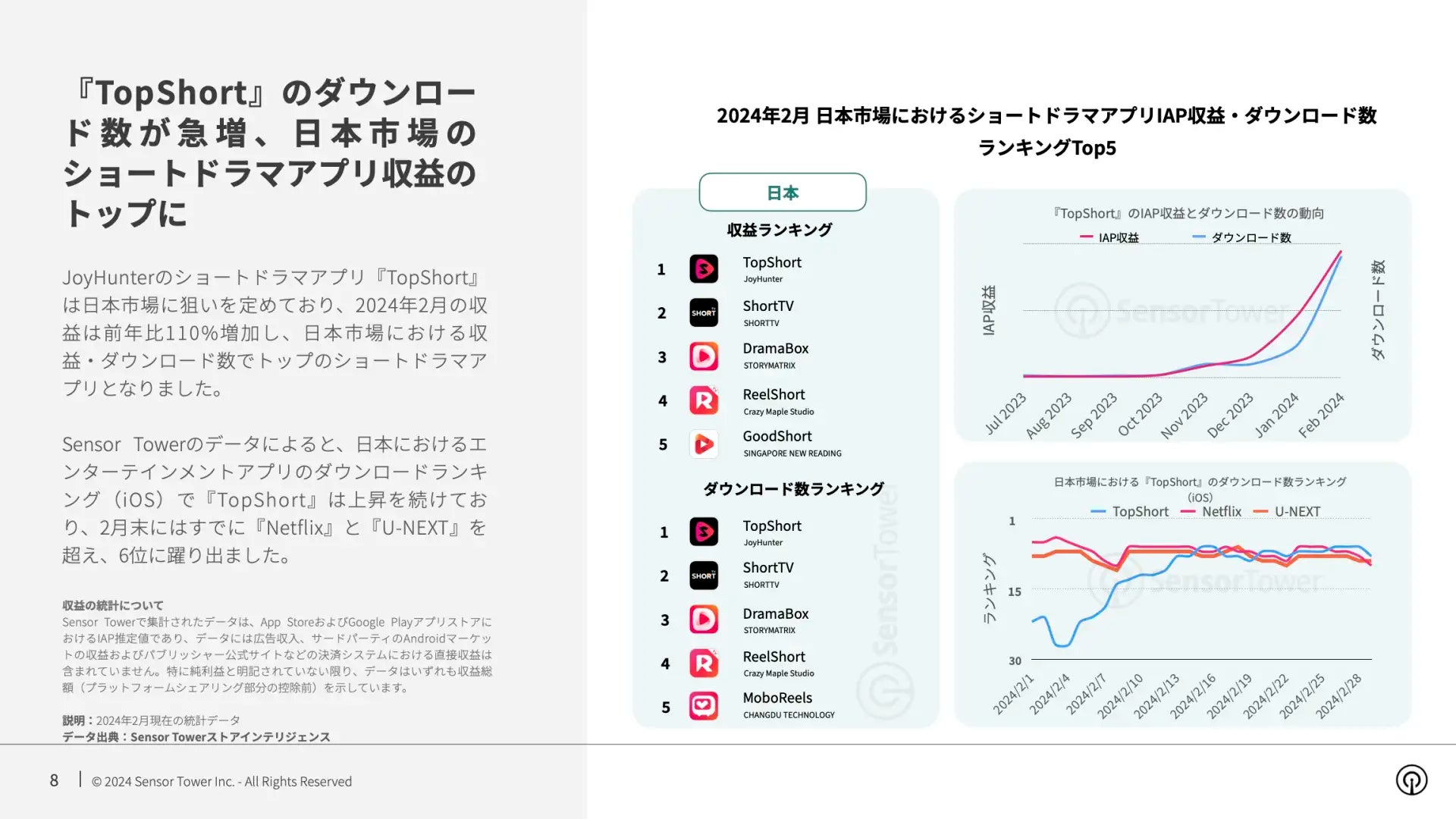 JoyHunterのショートドラマアプリ『TopShort』は日本市場に狙いを定めており、2024年2月の収益は前年比110%増加し、日本市場における収益・ダウンロード数でトップのショートドラマアプリとなりました。Sensor Towerのデータによると、日本におけるエンターテインメントアプリのダウンロードランキング(iOS)で『TopShort』は上昇を続けており、2月末にはすでに『Netflix』と『U-NEXT』を超え、6位に躍り出ました。