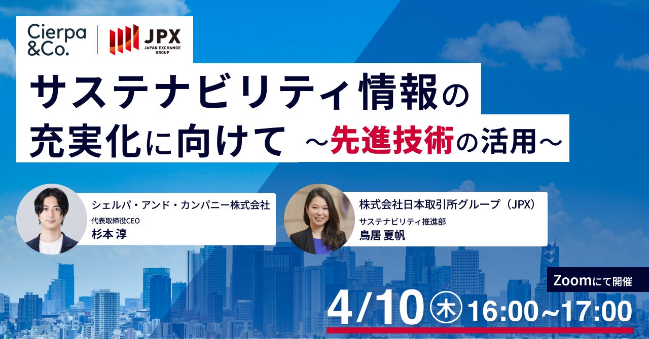 シェルパ・アンド・カンパニー株式会社(本社:東京都品川区、代表取締役CEO 杉本淳、以下シェルパ)は、株式会社日本取引所グループ(本社:東京都中央区、取締役兼代表執行役グループCEO 山道裕己、以下JPX)と「JPXサステナビリティ情報検索ツール(ベータ版)」(以下本ツール)の提供開始を記念した共催セミナーを2025年4月10日に開催します。