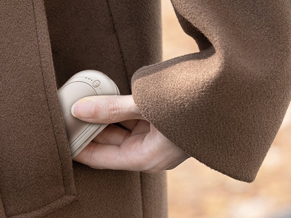 本体はロックで着脱できるセパレートタイプの充電式カイロです。切り離して左右別々に持って使うことも、ロックで接着して一つのカイロとして使うこともできます。丸みを帯びたデザインなので、握りやすい上に触り心地も良く、誤って手を傷つけてしまうこともありません。カラーはナチュラルなベージュ。シンプルでありながら温かみがあり、落ち着いた雰囲気を演出してくれます。