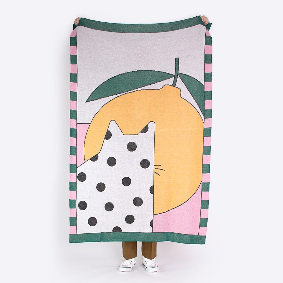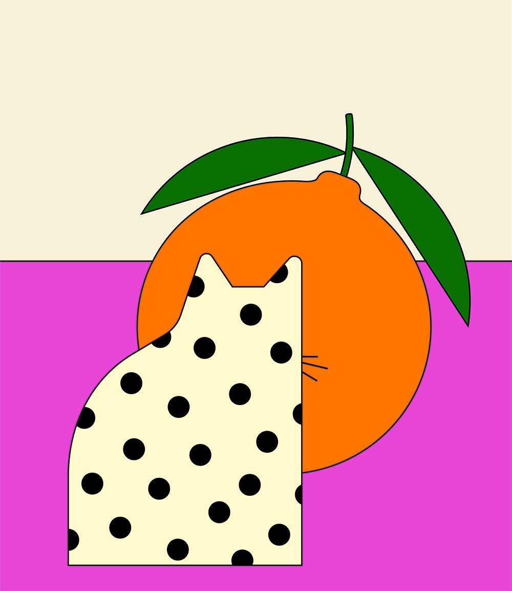 Step into a world where fresh fruit and a dotted cat take the spotlight against a vibrant, plain background. A sunny orange and playful cat steal the show in this illustration where colours are popping against the simplicity of their surroundings. From the series ‘Fruity Whiskers’