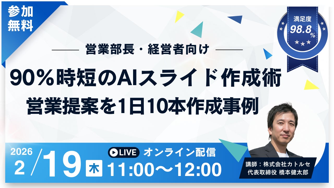 2026年2月19日(木)11時~12時、オンラインセミナー「90%時短のAIスライド作成術:営業提案を1日10本作成する事例」を開催します。