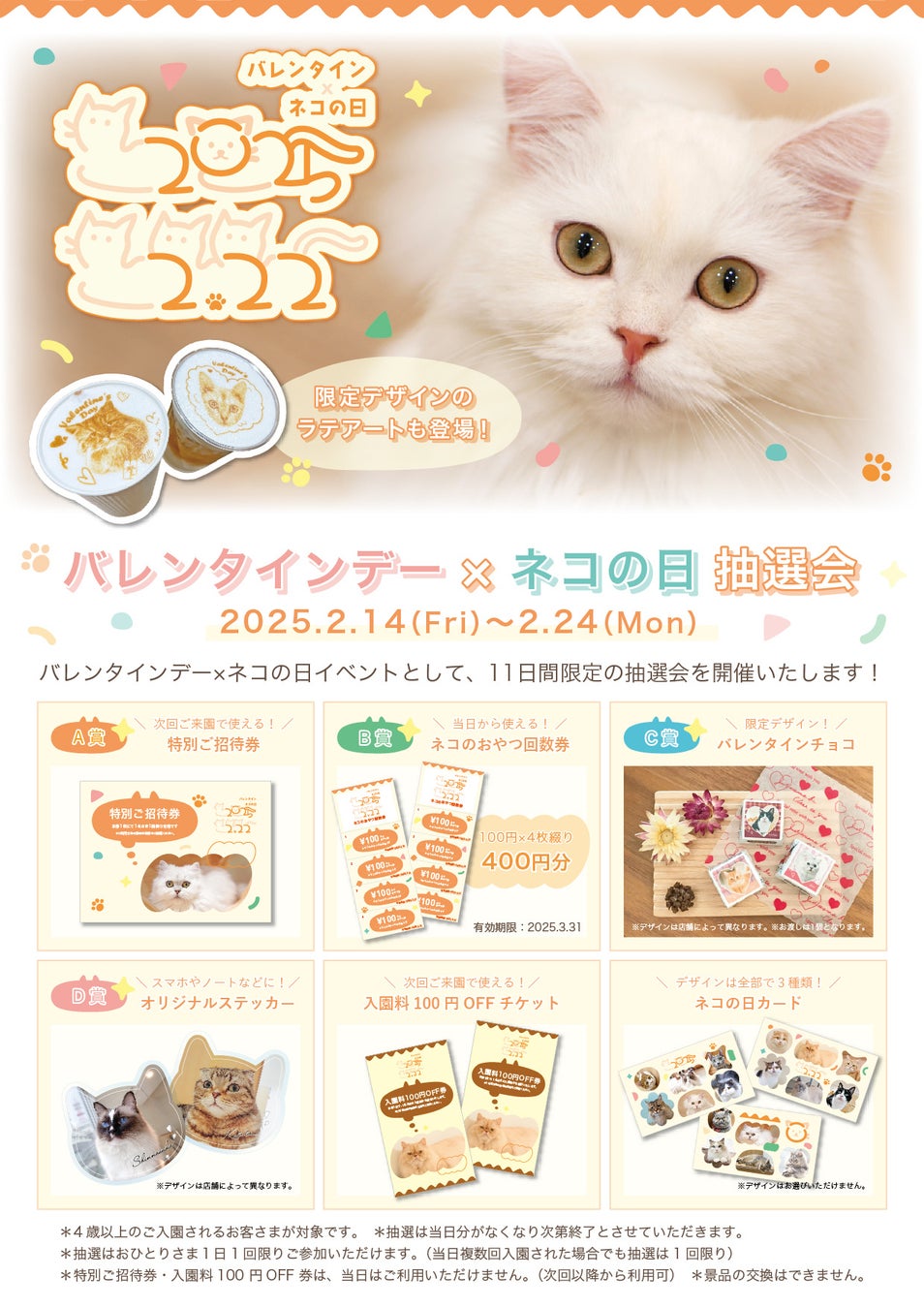 バレンタインデーとネコの日のコラボレーション!!毎年大好評のネコの日イベントが実施店舗拡大で開催いたします。