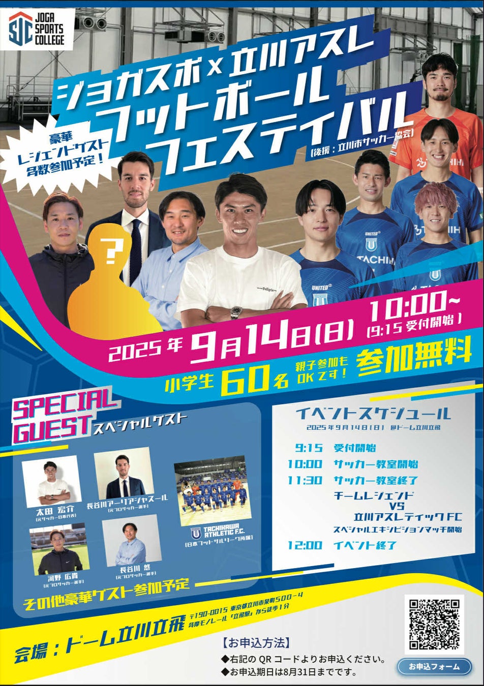 立川アスレティックFCは9月14日(日)にJOGASPO(ジョガスポ)様と「ジョガスポ×立川アスレ フットボールフェスティバル」(後援:立川市サッカー協会)を開催します。