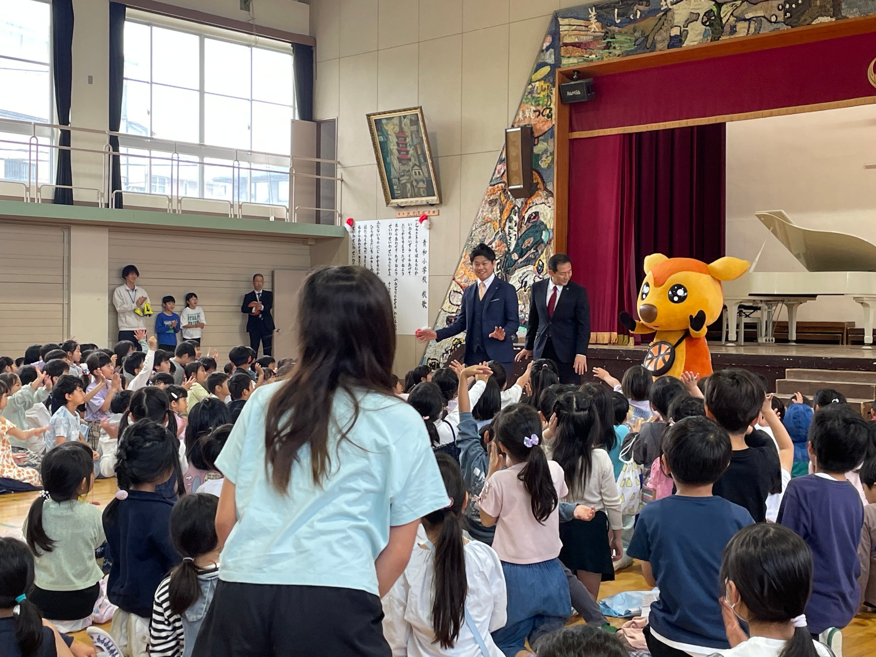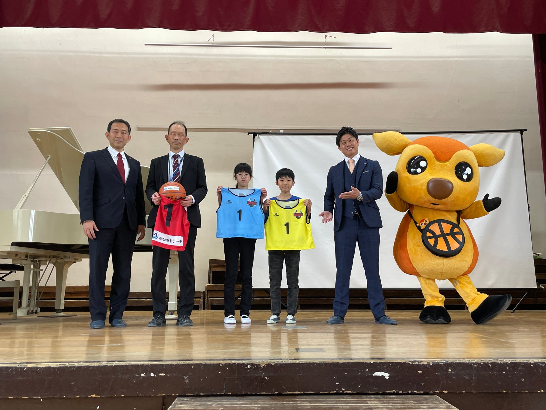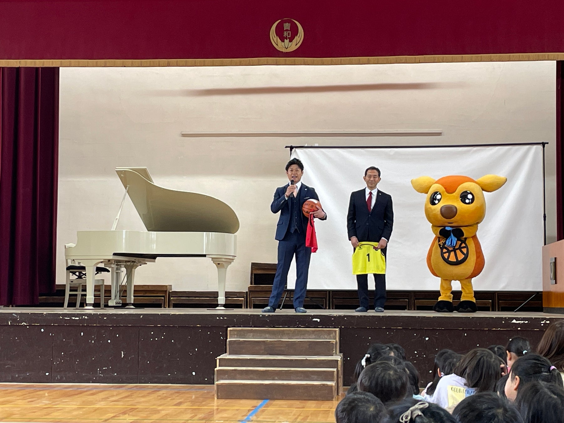 5月12日には、青和小学校の朝礼の時間に、株式会社トラ―チの稲場基泰 代表取締役とバンビシャス奈良 代表取締役 加藤真治、シカッチェが登壇し、五十嵐和弘 校長と体育委員長、体育副委員長の3名へボールとビブスが手渡されました。