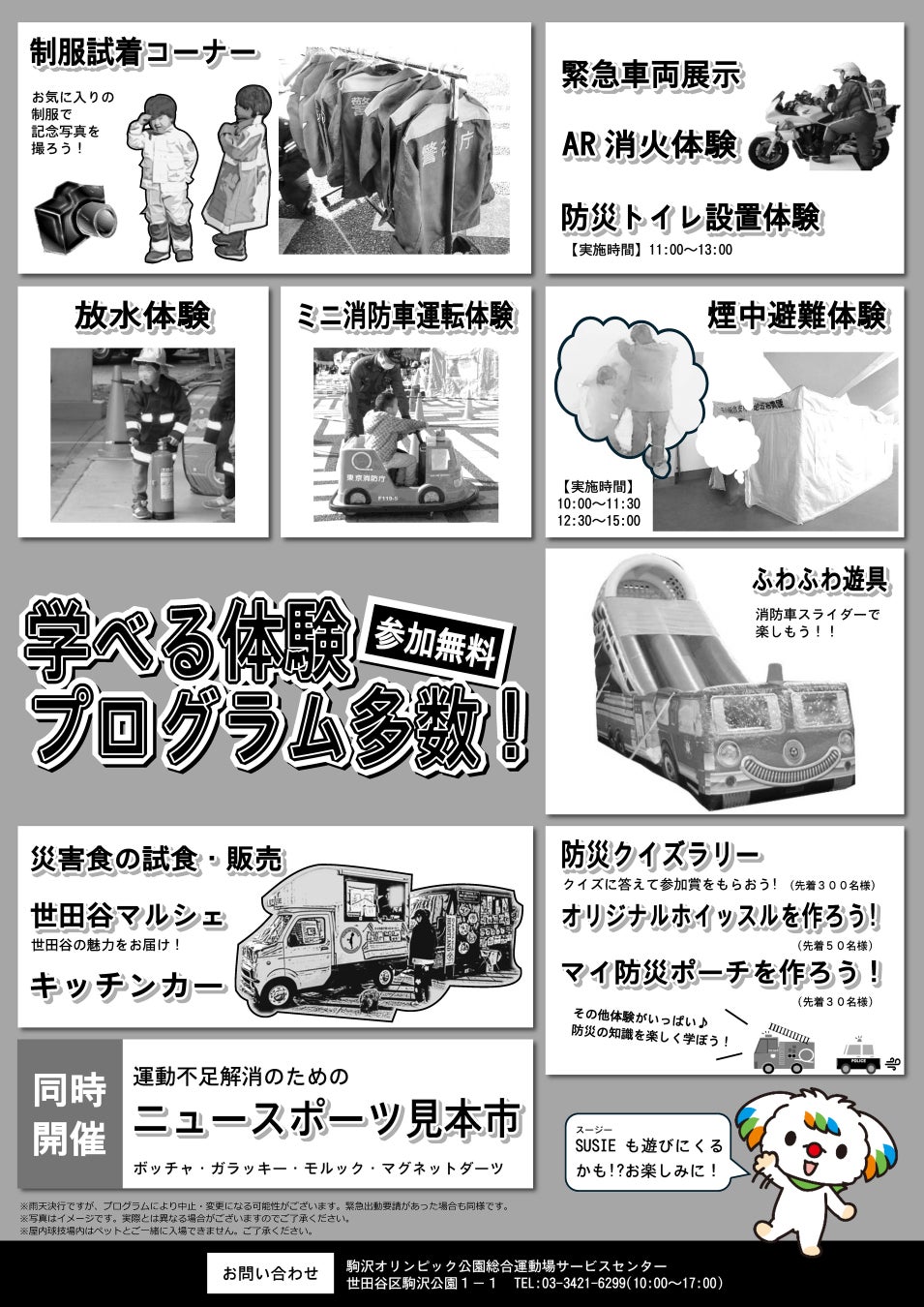 「スポーツで創る東京の未来」をスローガンに、「スポーツフィールド・東京」の牽引役として様々な事業を展開する公益財団法人 東京都スポーツ文化事業団(渋谷区・千駄ヶ谷、以下「東京都スポーツ文化事業団」)は、2月15日(土)、駒沢オリンピック公園総合運動場にて、非常時に役立つ知識をたのしく学ぶことができる「防災フェスタ in KOMAZAWA」を開催します。当イベントでは、火災時の避難を想定した「煙中避難体験」や、緊急車両展示、消防士や救護隊の制服試着など、防災にまつわる体験プログラムを多数行います。また、物販やキッチンカー、ふわふわ遊具も設置予定ですので、子供から大人まで、大切な知識を楽しみながら身につけていただくことができます。この機会にぜひ、“もしもの時の備え”を見直してみてください。