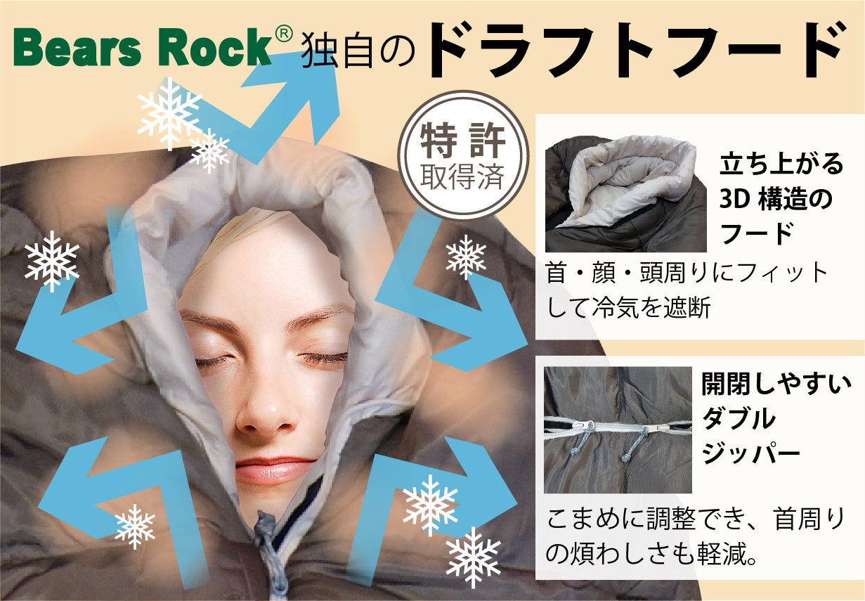 Bears Rockのロングセラー、冬用マミー型センタージッパー寝袋に、暖かいフリース素材のインナーシュラフと、さらに車中泊で役立つ用品を1つの袋に収めています。