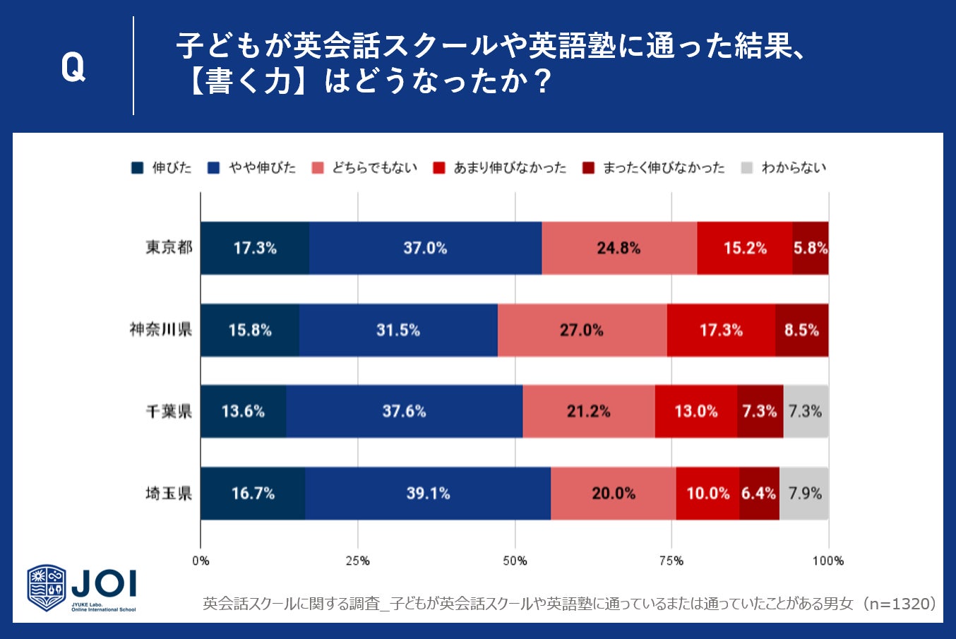 東京都や千葉県も2割を超える親が子供の英語ライティング能力の伸び悩みを感じており、一都三県全体での英会話スクール・英語教室のライティング力を伸ばす為の教材の見直し、指導方法の改善が求められる結果となっています。