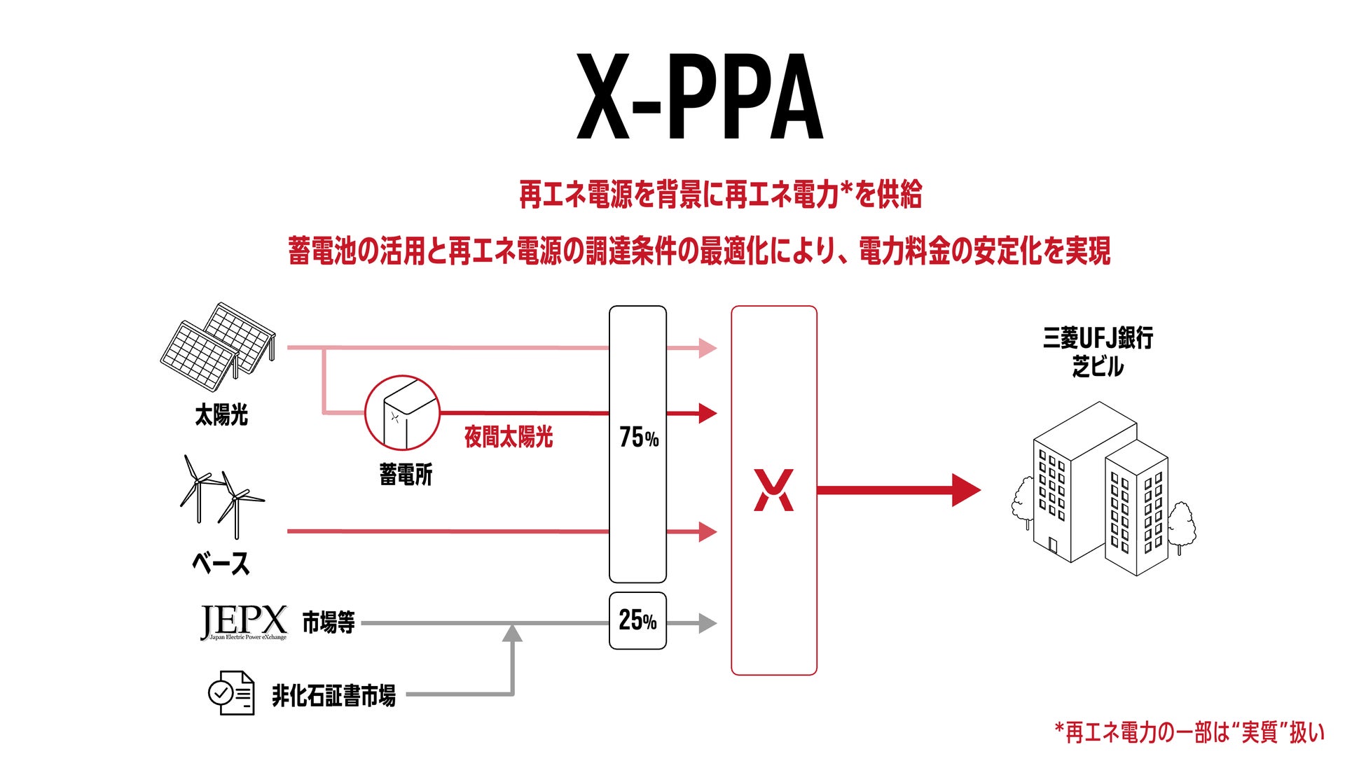 株式会社パワーエックス(東京都港区、取締役兼代表執行役社長 伊藤 正裕、以下「パワーエックス」)は、株式会社三菱UFJフィナンシャル・グループ代表執行役社長 亀澤宏規、以下 MUFG)の連結子会社である株式会社三菱UFJ銀行(取締役頭取執行役員 半沢淳 一、以下「三菱 UFJ 銀行」)が所有する「三菱UFJ銀行 芝ビル」へ、2024年7月から蓄電池を活用した再エネ電力を供給します。本件は、当社の電力供給サービス「X-PPA」を首都圏のオフィスビルに導入する初の事例となります。今後もパワーエックスは再エネ電力供給を通じて、MUFGが2030年までの目標として掲げる温室効果ガス(GHG)排出量ネットゼロ達成を支援して参ります。