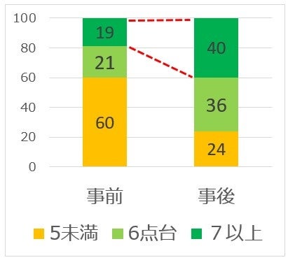 スコア7以上の比率が19%から40%に増加し、5未満の比率が60%から24%に減少。
