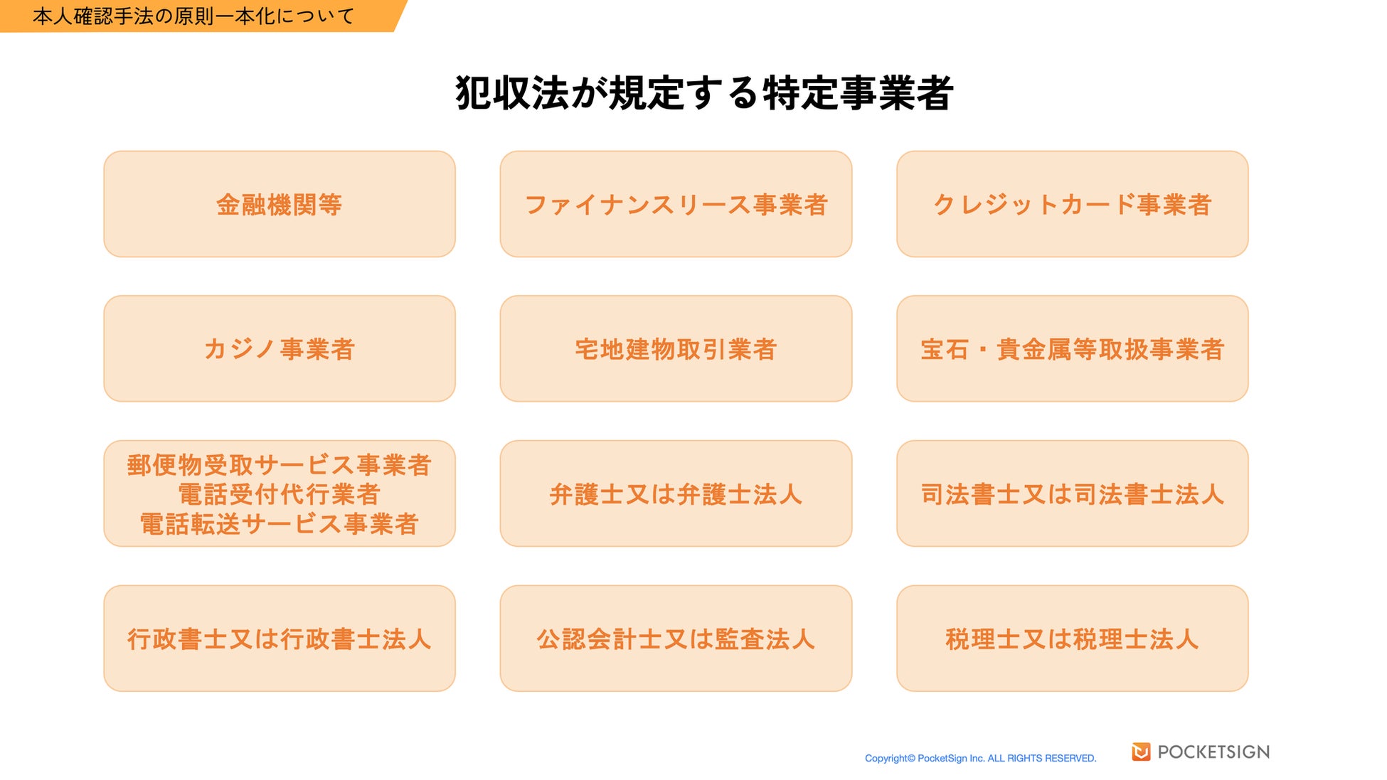 これにより、犯収法上の特定事業者(下図)はオンラインでの本人確認において公的個人認証への対応を迫られます。