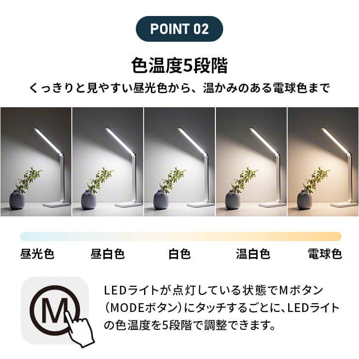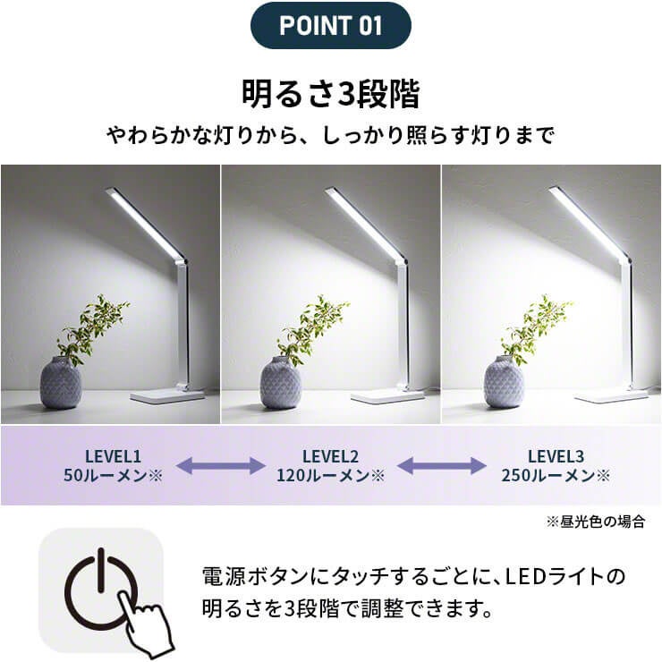 明るさ3段階×調光5段階の最大15パターンの調光で、お客様の作業環境や気分に合わせて照明を調整することが可能です。