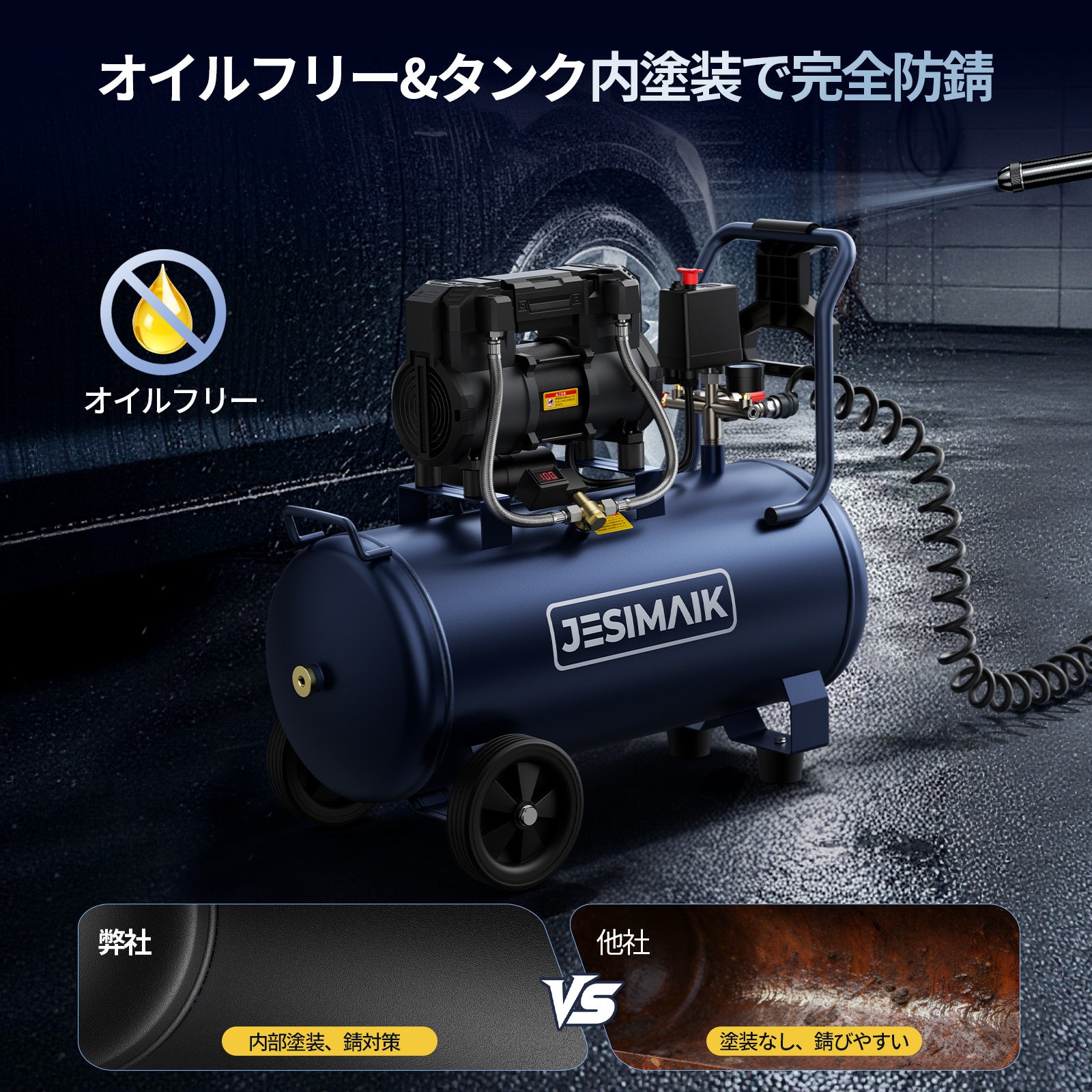 従来のエアコンプレッサーが抱えていた「騒音」「サビ」「移動のしにくさ」という3大課題を解決すべく、JESIMAIKは日本市場専用モデル「HSC40」を開発しました。