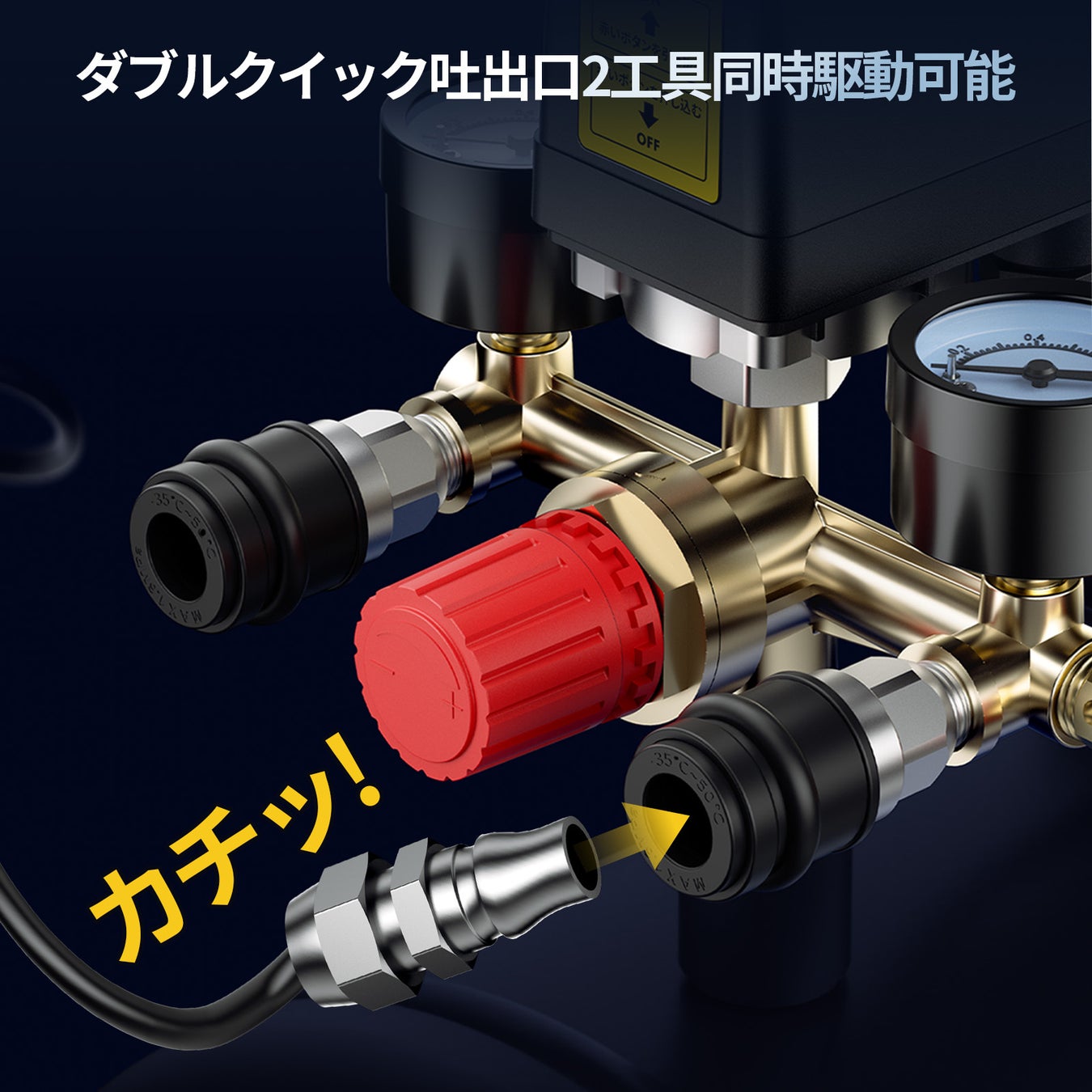 デュアルポート設計によりエアツールの2台同時使用が可能で、多様な作業ニーズに応えます。
