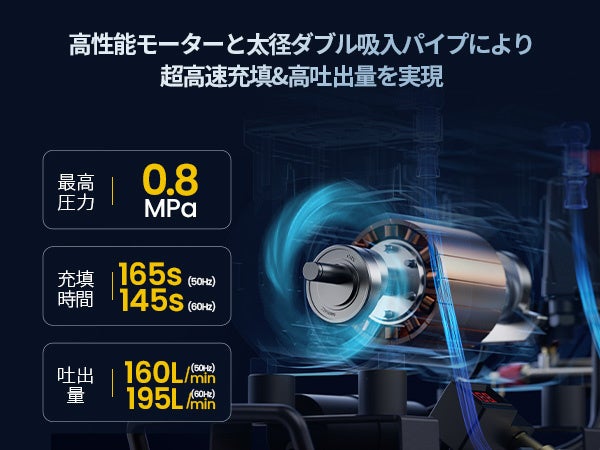 さらに、太径ダブル吸気システムを備えた高性能モーターにより、40Lの満充填をわずか145秒/165秒(同クラス機:約240秒)で完了。最大160L/195Lの吐出量でエアー切れを防ぎ、静かで高効率な作業環境を提供します。