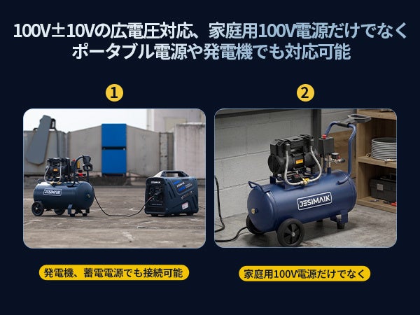 日本の電源環境に合わせた100V±10%の広電圧設計で、発電機やポータブル電源にも対応。