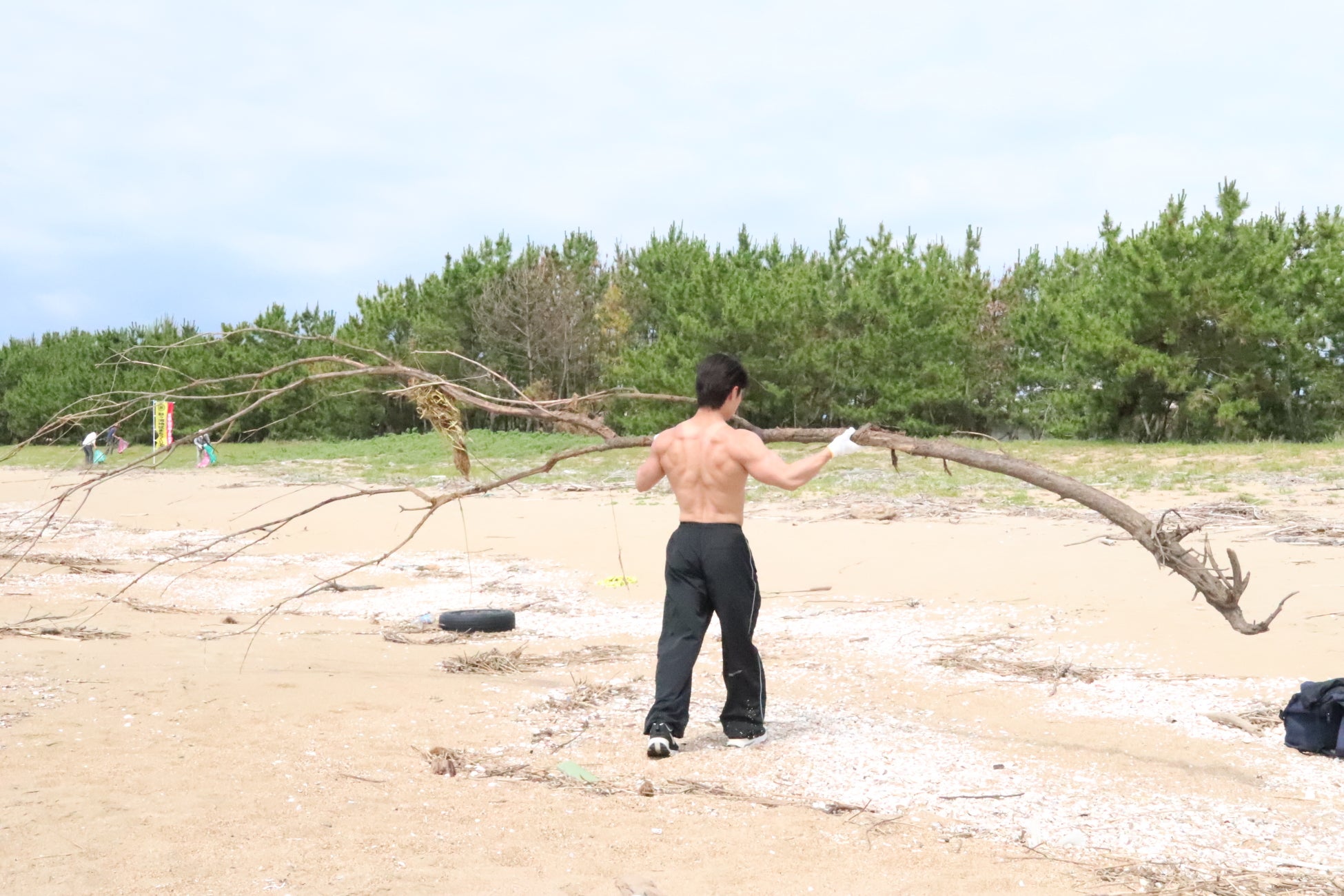 現地の海岸には、大きな流木やタイヤ、木枠などの重量物も数多く漂着しており、清掃には体力が求められましたが、マッチョ介護士の力を活かしながら撤去作業を進め、地域住民の皆様と連携して活動を行いました。清掃中には、地域住民との交流も深まり、活動を通じて地域社会との新たなつながりが生まれました。