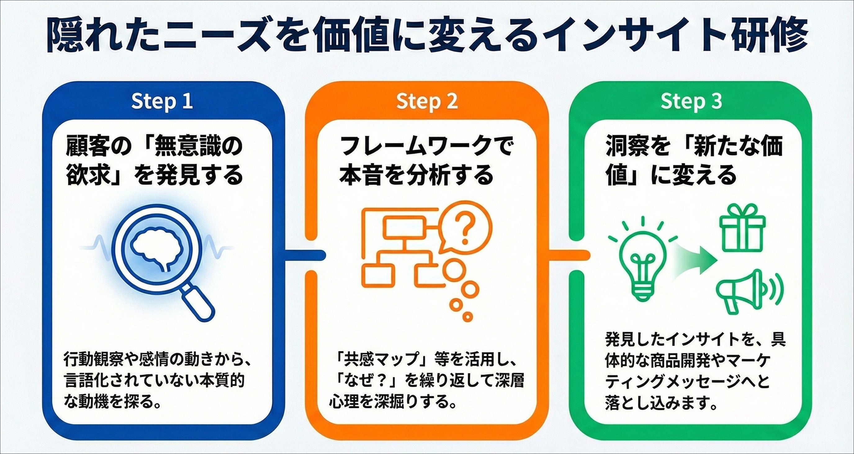 顧客自身も気づいていない深層心理「インサイト」を導き出し、競合と差別化した価値提案や具体的な事業成果へとつなげる実践的なカリキュラムを体系化しました。