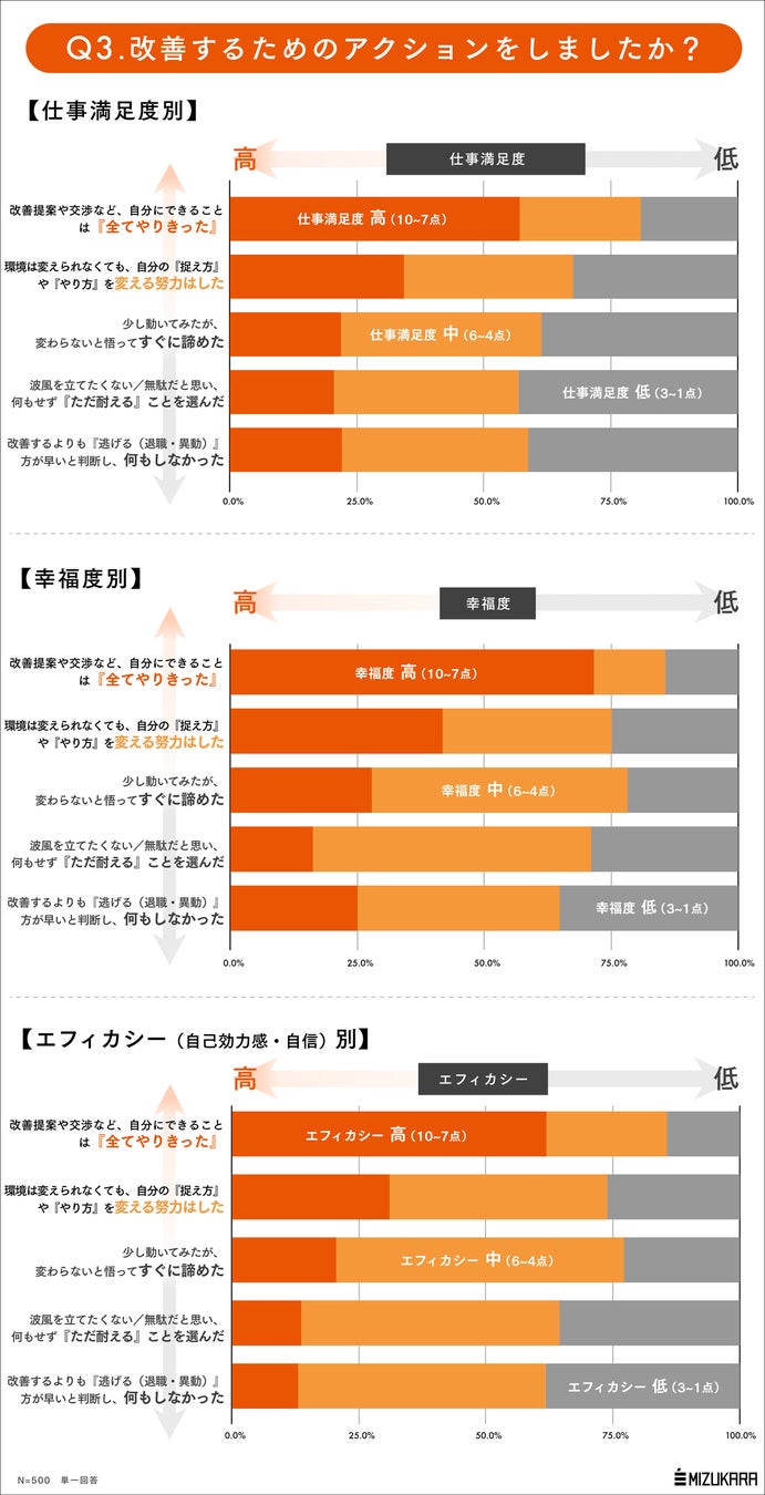 職場で不具合を感じた時にどのようなアクションをとるかによって心理的な影響はあるのでしょうか?様々な指標とクロス分析してみたところ、改善提案や交渉など「自分にできることは全てやりきった」と回答した人は現在の仕事満足度や幸福度、エフィカシー(自己効力感・自信)などがいずれも高い結果となりました。それがうまくいったにせよ、結果転職したにせよ、自分ができる範囲をやりきることが大事なようです。