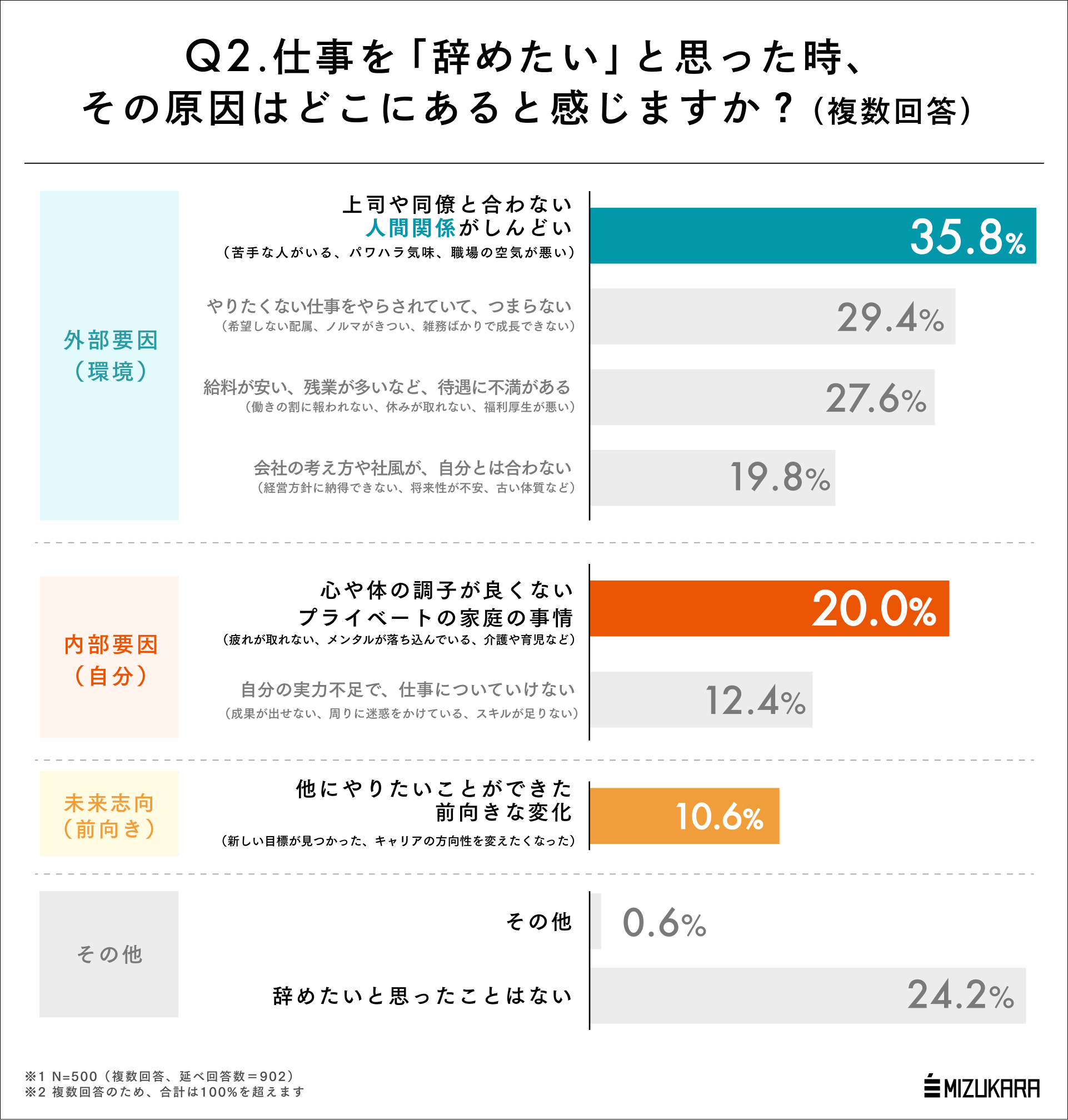 さて、仕事を「辞めたい」と思う原因についても深掘りしていきましょう。圧倒的に多いのは上司や同僚など「人間関係が合わない」という回答で、35.8%にのぼりました。その他も外部要因が多く、転職を検討する動機は基本的に会社や仕事内容への不満が多く、その退避行動として転職する人が多いということがわかります。