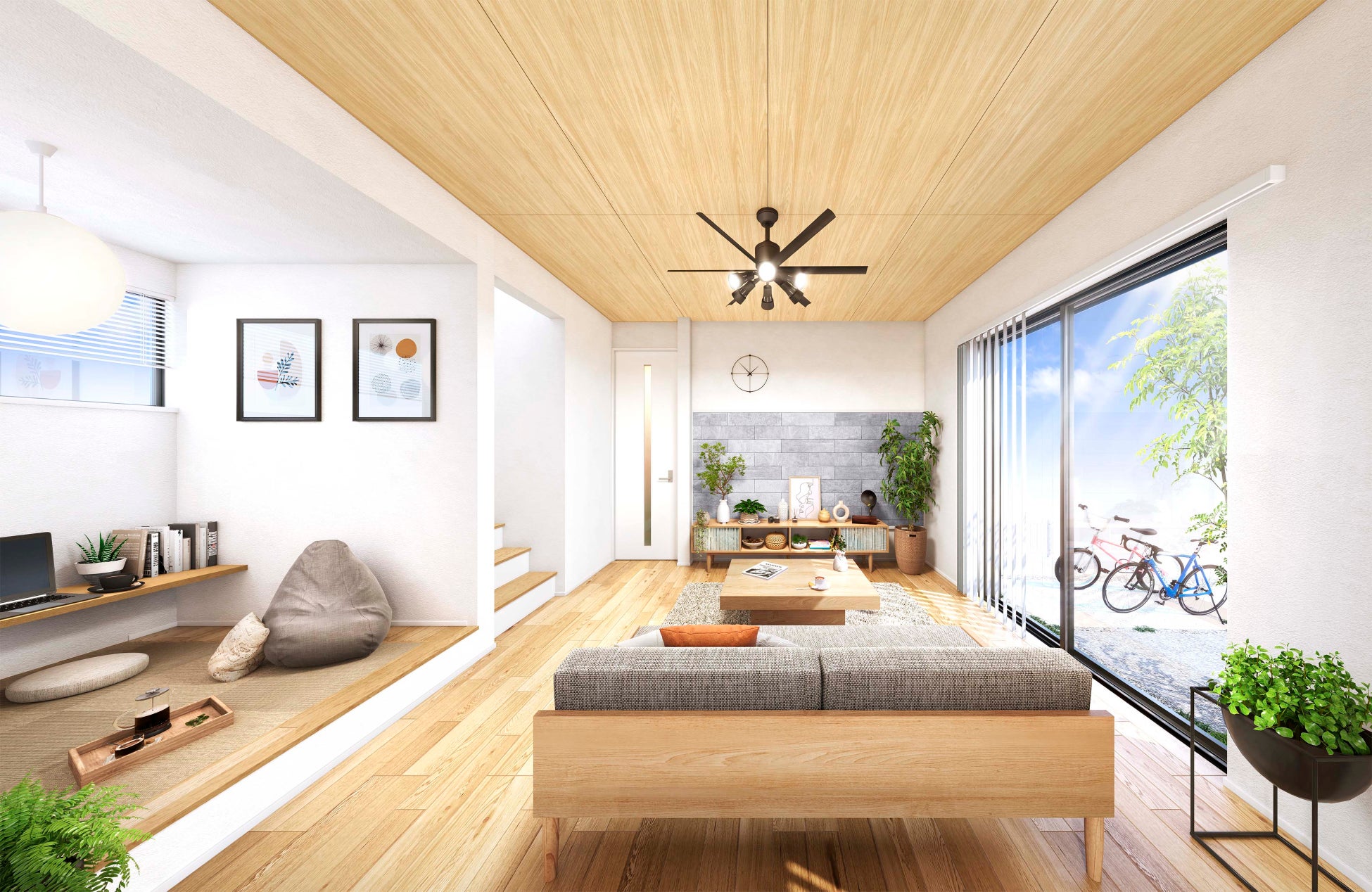 リビング天井の一部にシナ合板を採用。空間を優しく区切りながら、木目の柔らかな印象が 家族のくつろぎ空間を優しく彩ります。